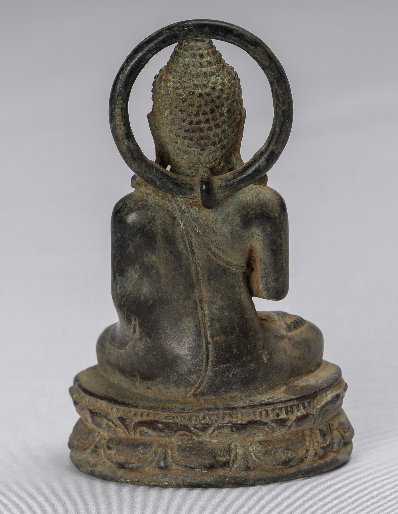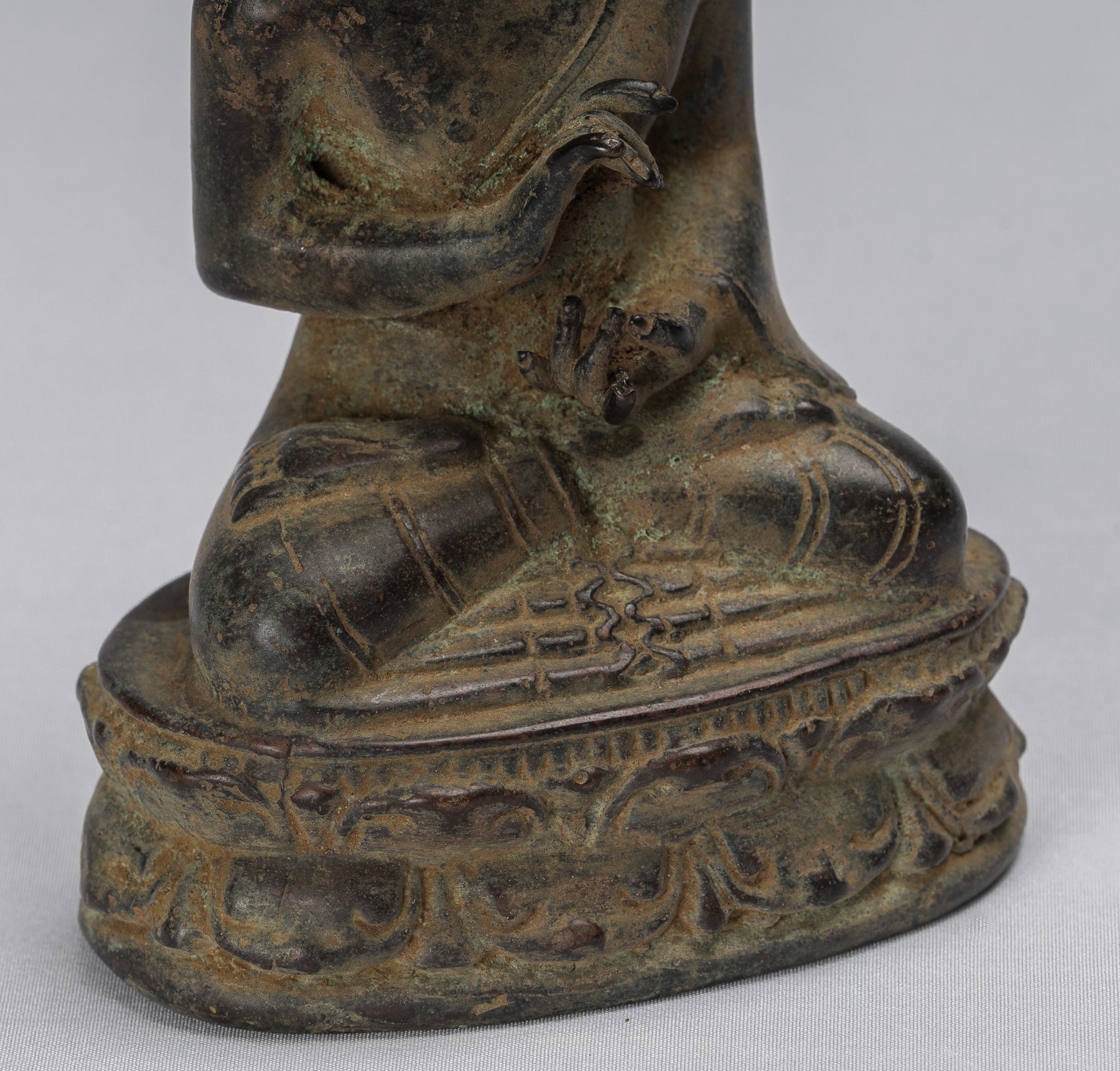 The Buddha is seated on a round double lotus petal base, which is itself sat upon a decorated pedestal. The lotus flower represents purity, compassion and the giving of great joy to all.