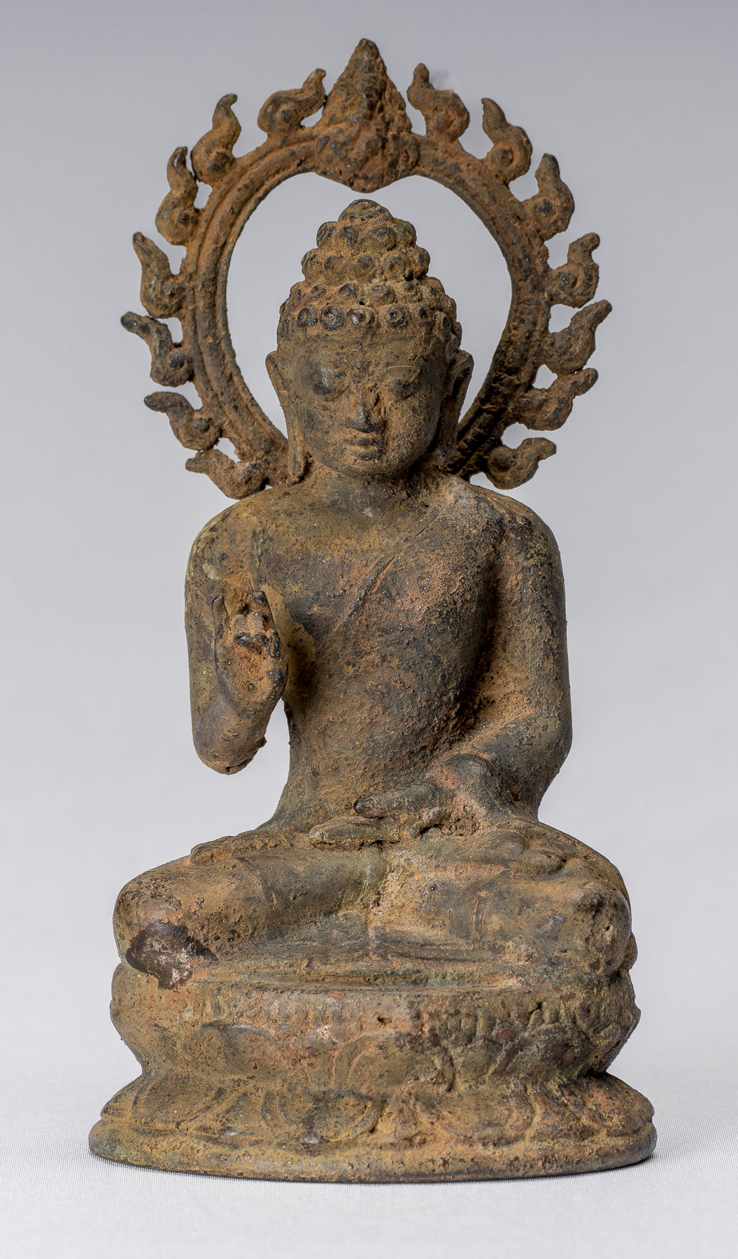 A flame rimmed aureole, with decorated finial sits behind the head of the Buddha. This circle of light symbolises his divinity.