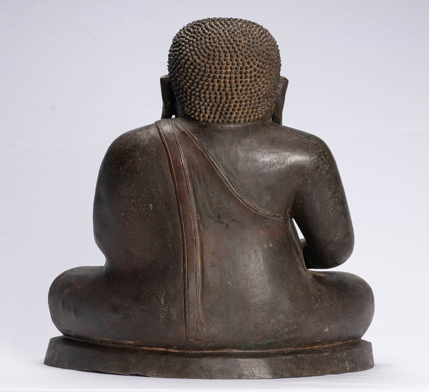 An antique Thai style bronze Laughing Buddha or Budai. The Buddha has a peaceful countenance with downcast introspective eyes and a firm brow. His earlobes are stretched long from a youth spent as a prince wearing heavy gold earrings.