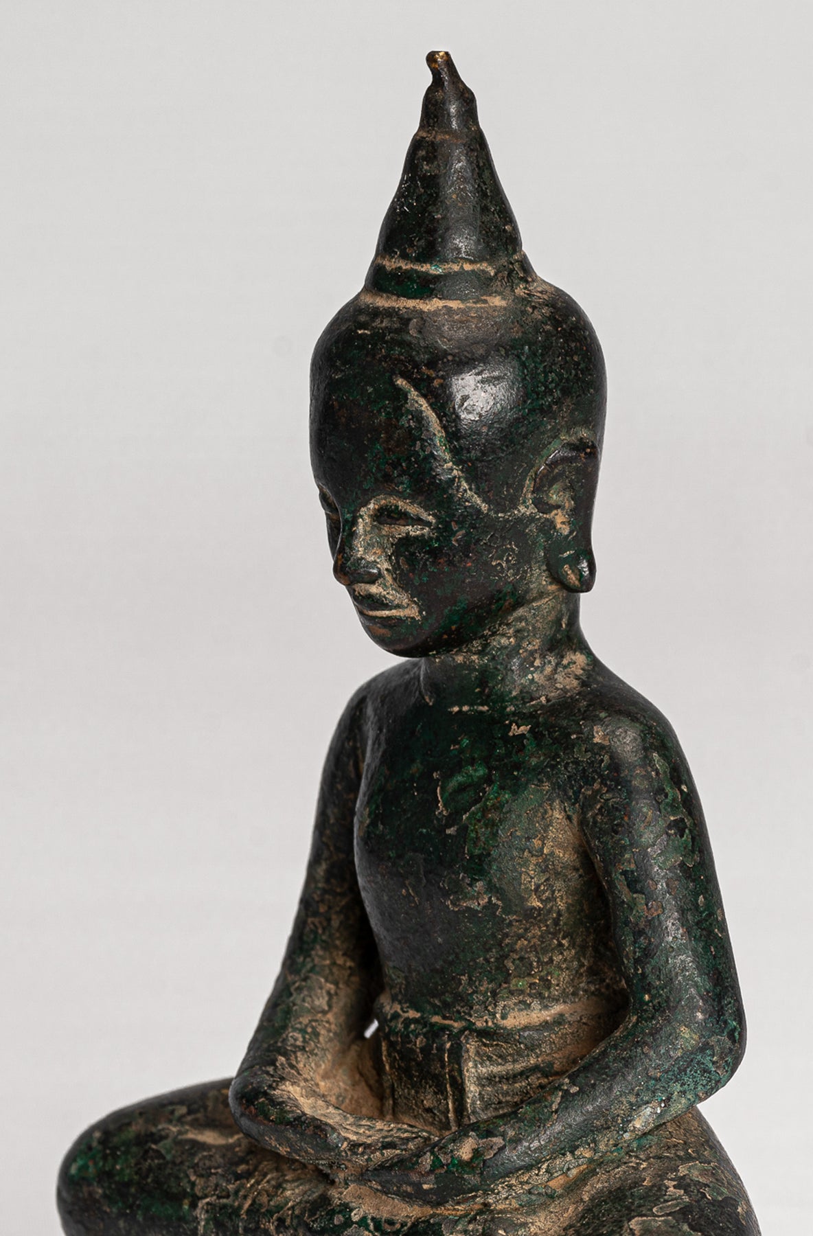 His hands rest in Dhyana mudra, the gesture of meditation, evoking deep contemplation and inner stillness. The face is serene and naturalistic, with a warm, composed expression; the hair is simply rendered and rises into a lotus‑flower‑shaped ushnisha, symbolising advanced spiritual attainment. Half‑closed eyes suggest inward focus, while the softly modelled mouth and lightly dimpled chin add a subtle, human tenderness.