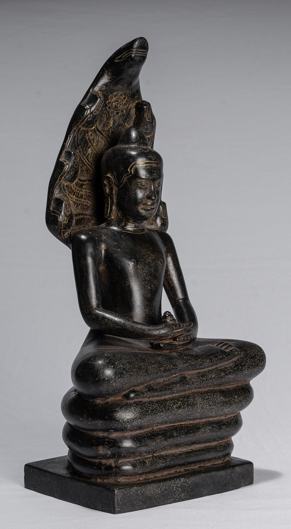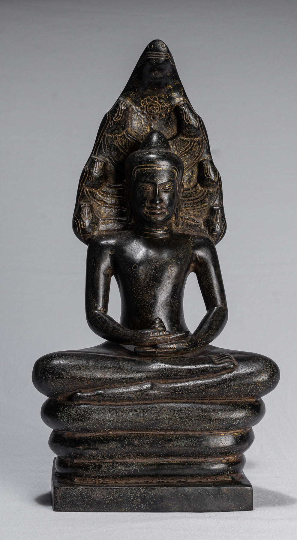 A Khmer style seated meditation Buddha, seated on a three-tired throne, with the flaring head of a giant Naga, the serpent King Muchalinda, rising behind protectively behind. His hands are in the Dhyana mudra, the gesture of Medtiation.