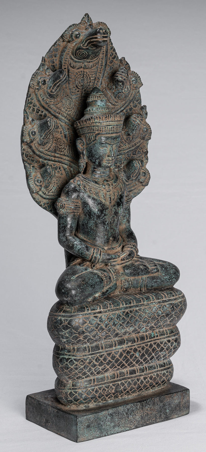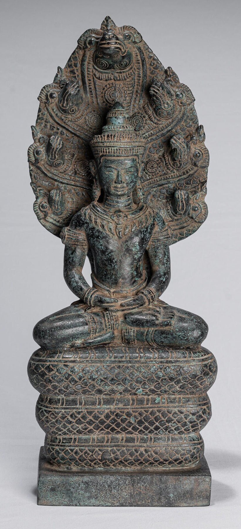 A Khmer style seated meditation Buddha, seated on a three-tired throne, with the flaring head of a giant Naga, the serpent King Muchalinda, rising behind protectively behind.