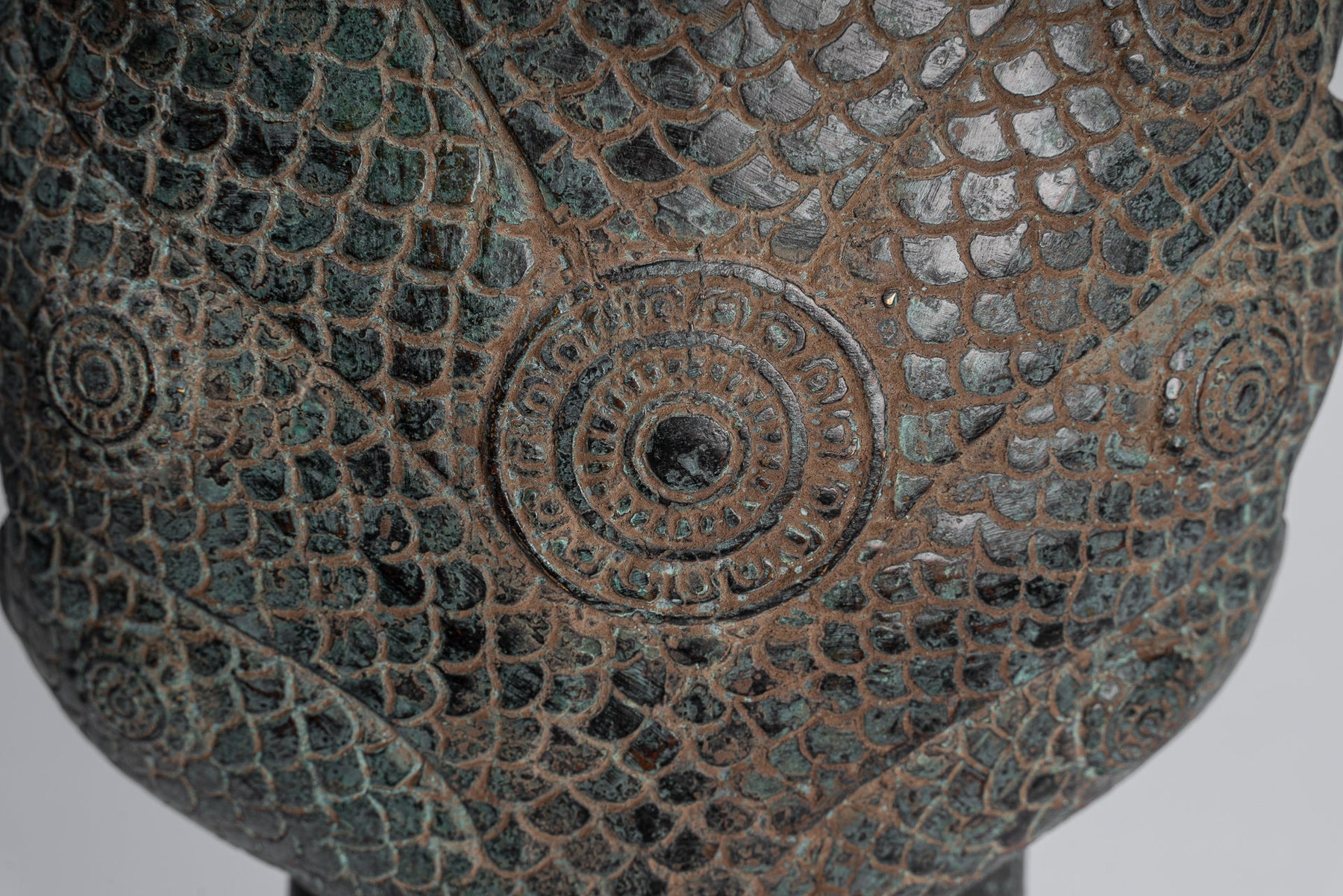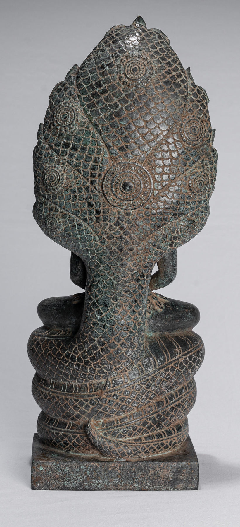 The serpent is well rendered and symmetrical. The throne is formed by the coils of the serpent. In the Buddhist culture the Naga or serpent offers protection. The story told here being that Muchalinda protected the Buddha from heavy rain.
