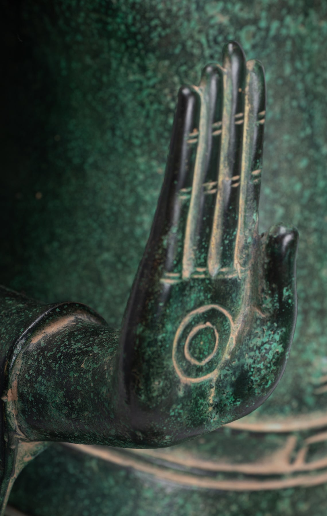 The Abhaya mudra, or “gesture of fearlessness,” is one of the oldest sacred hand gestures, offering protection, reassurance, and safety while dispelling fear and bestowing divine blessing. Both hands are raised to shoulder height, palms facing outward, marking this Buddha as a powerful symbol of courage and compassion across Hindu, Buddhist, and Jain traditions. In an age often marked by uncertainty and anxiety, this gesture serves as a timeless reminder that a path of inner steadiness and kindness can lead to peace and resilience.