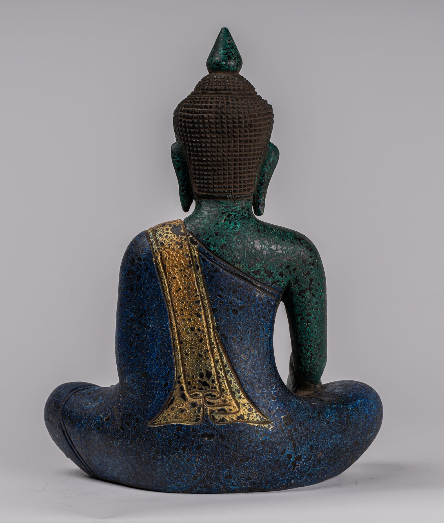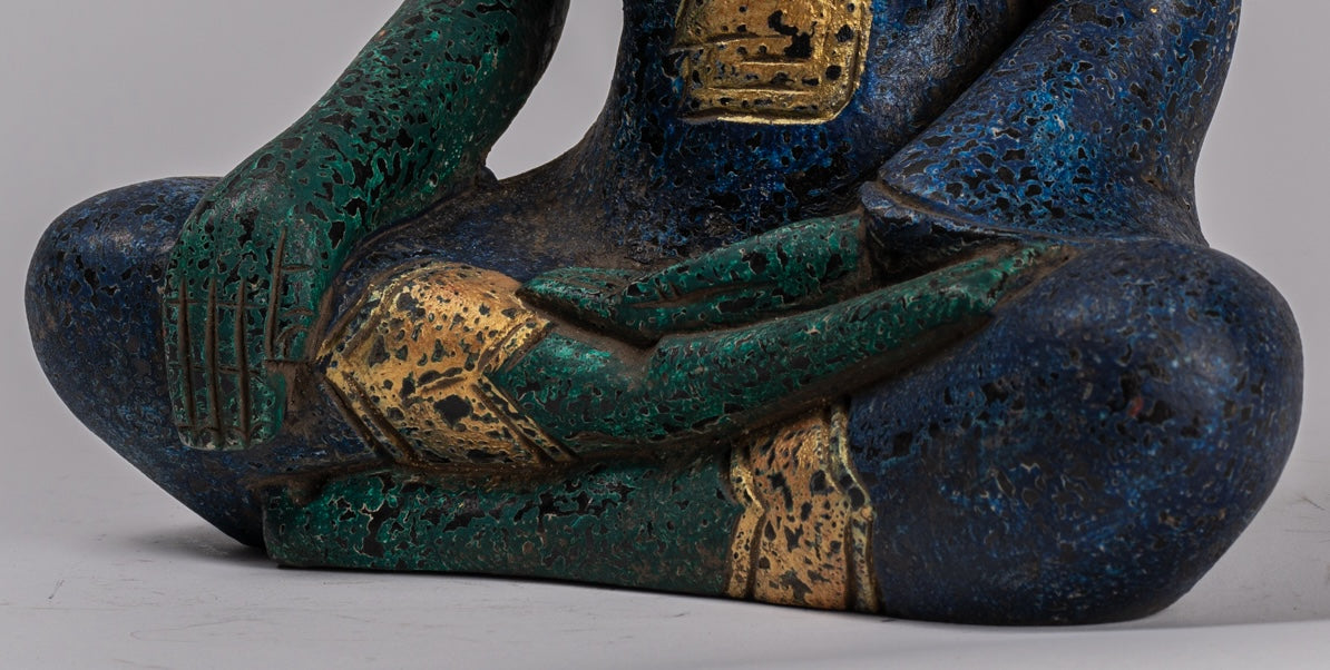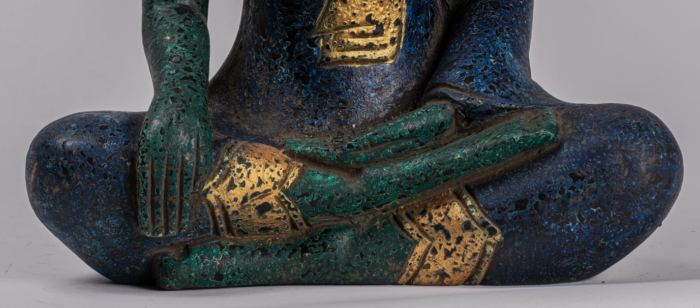Seated in the half lotus position he has large lotus flower shaped ushnisha protuberance on top of his head symbolizing his high level of spiritual development. The Buddha has a peaceful countenance with downcast introspective eyes and a firm brow. His earlobes are stretched long from a youth spent as a prince wearing heavy gold earrings.