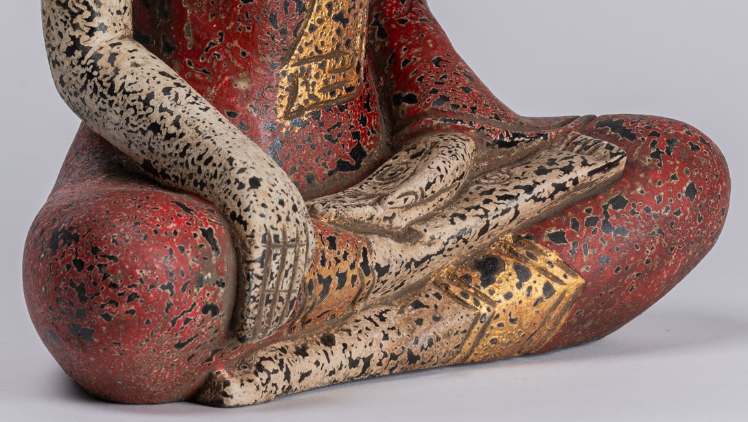 With fingers slightly touching the ground this position represents the subduing of Mara (a demon) who bombarded Buddha with demons, monsters, violent storms and the three seductive daughters. Remaining steadfast the Buddha testified to his meritorious past by pointing to the earth and calling the Earth Goddess, Thorani.