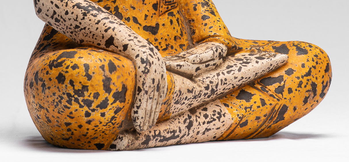 Seated in the half lotus position he has large lotus flower shaped ushnisha protuberance on top of his head symbolizing his high level of spiritual development. The Buddha has a peaceful countenance with downcast introspective eyes and a firm brow. His earlobes are stretched long from a youth spent as a prince wearing heavy gold earrings.