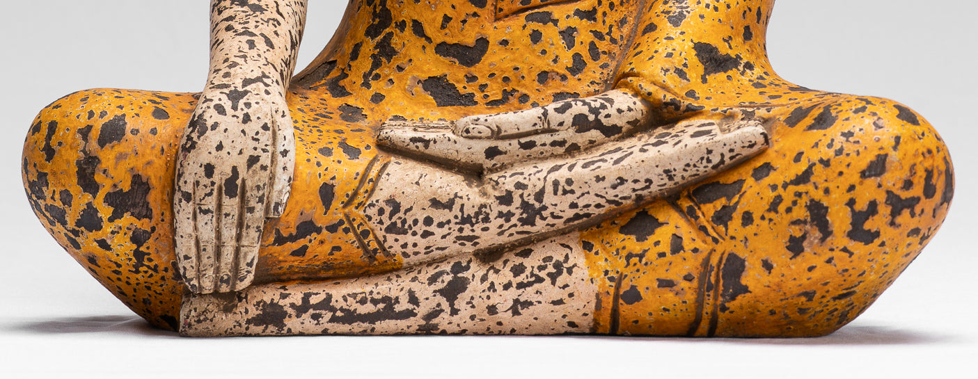 The Buddha is seated in the Bhumisparsa or 'Calling the Earth to Witness' mudra. With fingers slightly touching the ground this position represents the subduing of Mara (a demon) who bombarded Buddha with demons, monsters, violent storms and the three seductive daughters. Remaining steadfast the Buddha testified to his meritorious past by pointing to the earth and calling the Earth Goddess, Thorani.