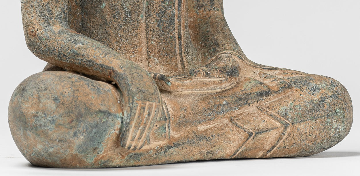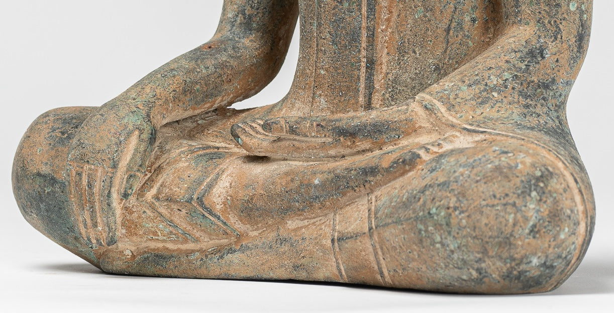 An antique Thai style bronze Buddha Shakyamuni in Enlightenment pose, in the cross-legged yogic, adamantine posture of vajraparyankasana, the right leg over the left, with the soles of both feet facing upward.