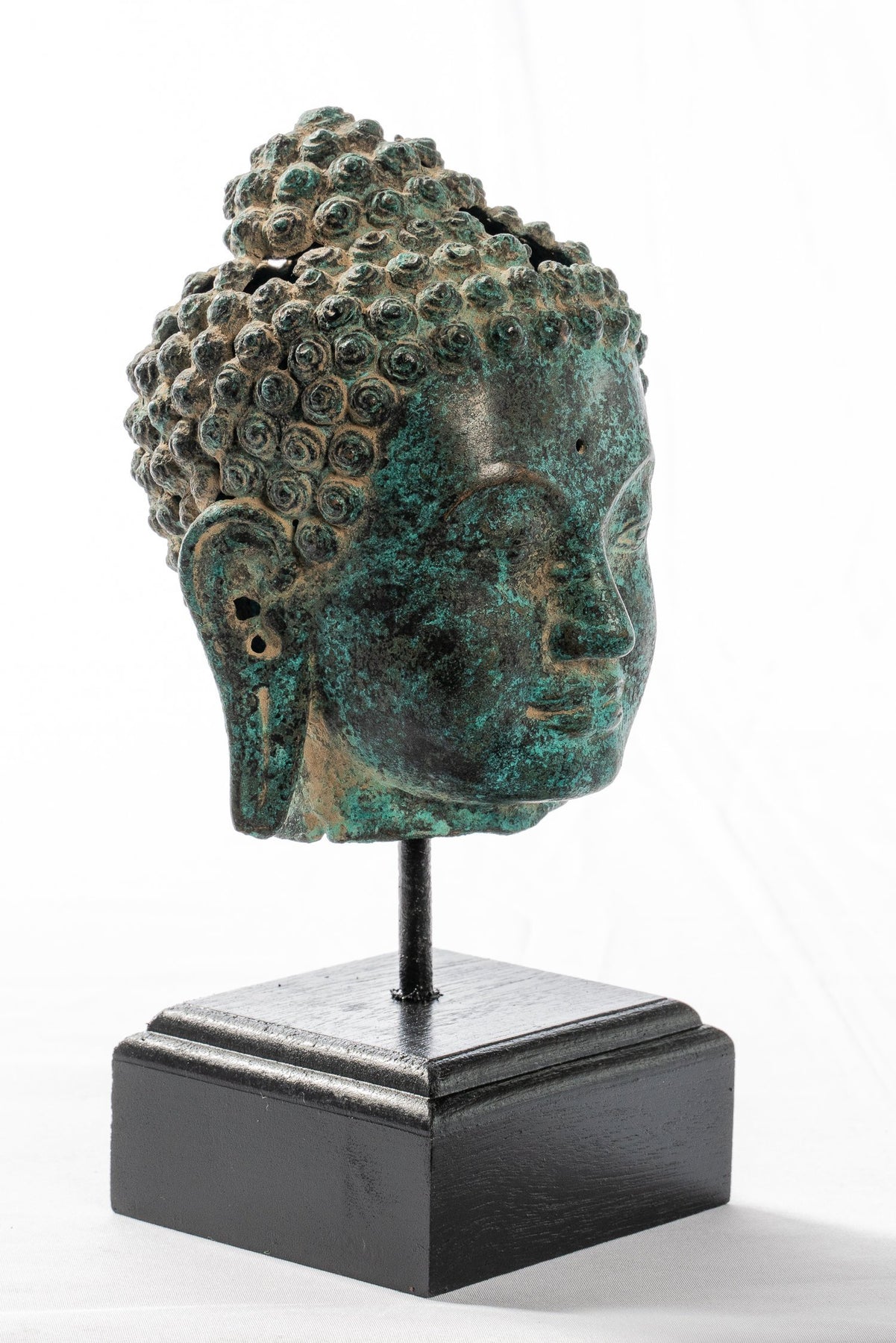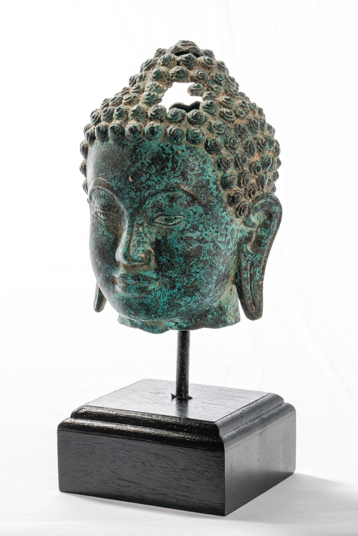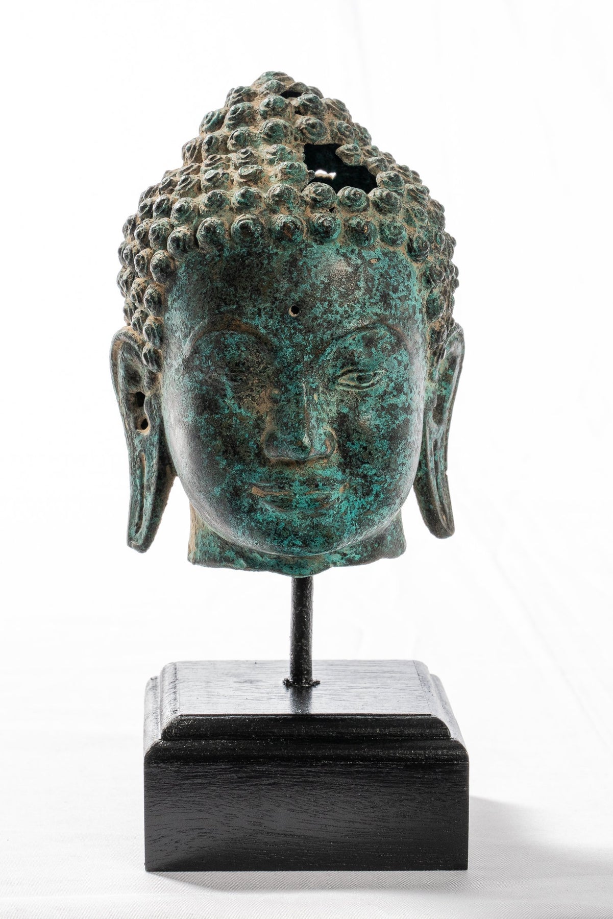 An antique Thai style, mounted Dvaravati Buddha head. A lovely Buddha with stunning detail and patina. The Buddha has a peaceful countenance with downcast introspective eyes and a firm brow. His earlobes are stretched long from a youth spent as a prince wearing heavy gold earrings. The casting is beautiful as you can see in the fine details of the face. Each detail is rendered perfectly. The distinctive patina of the piece is also particularly delightful.
