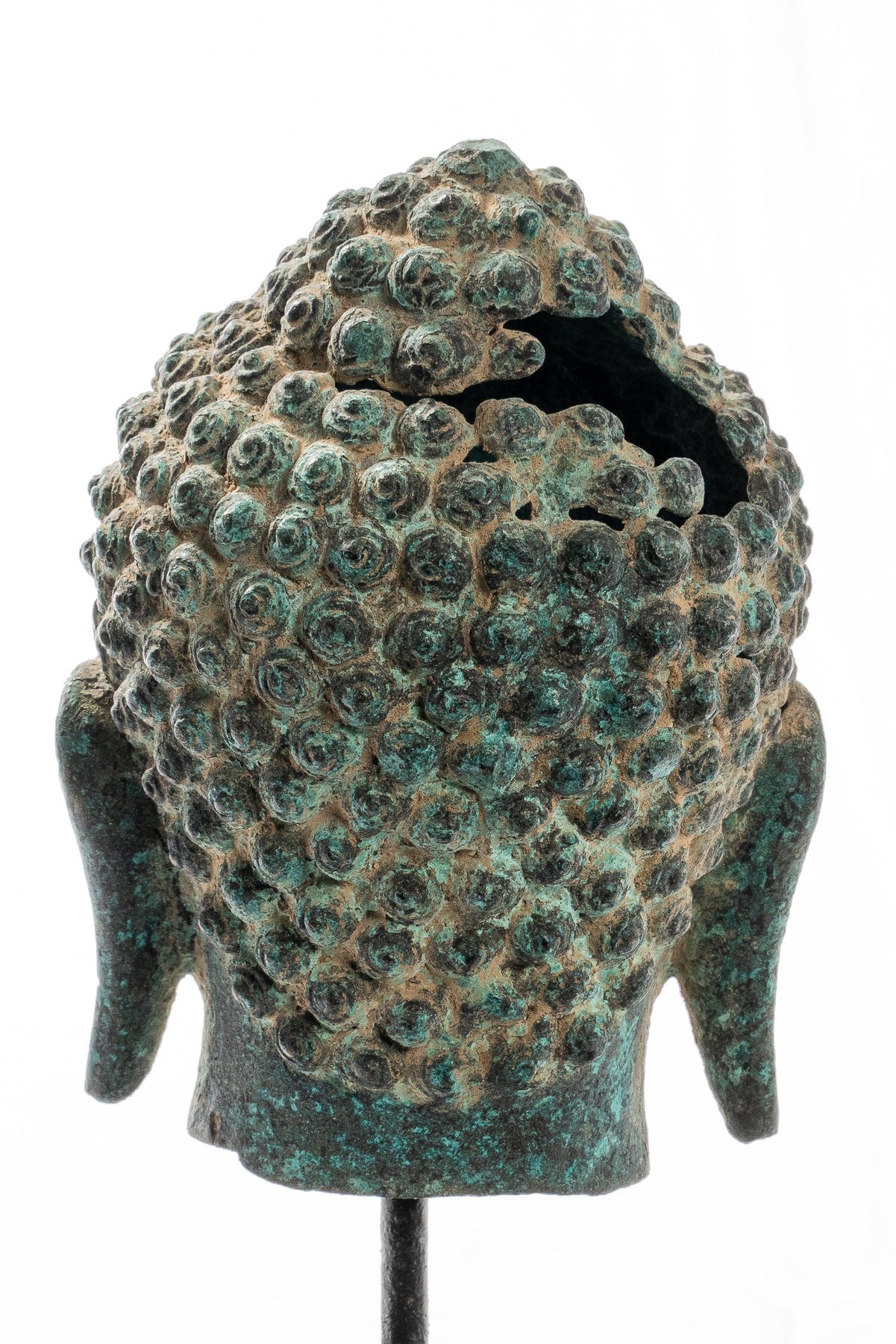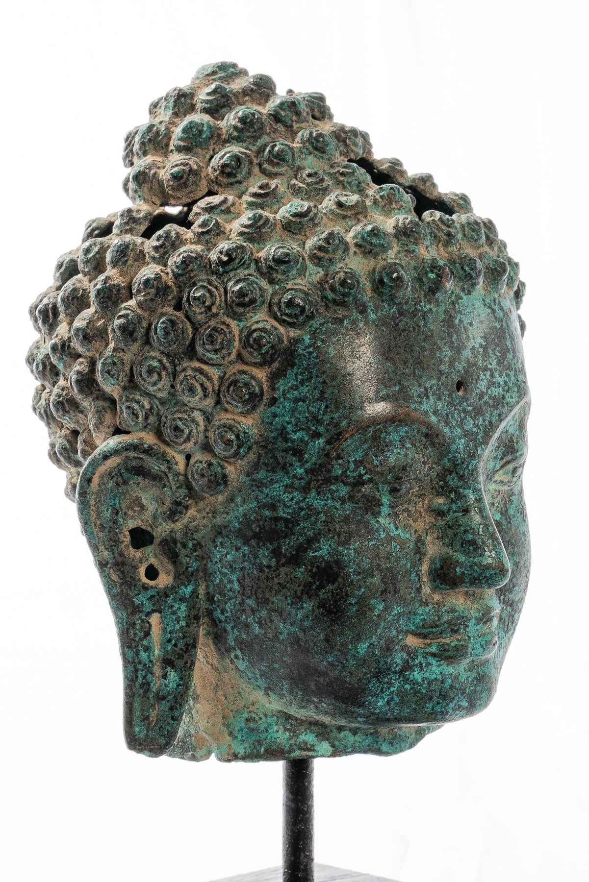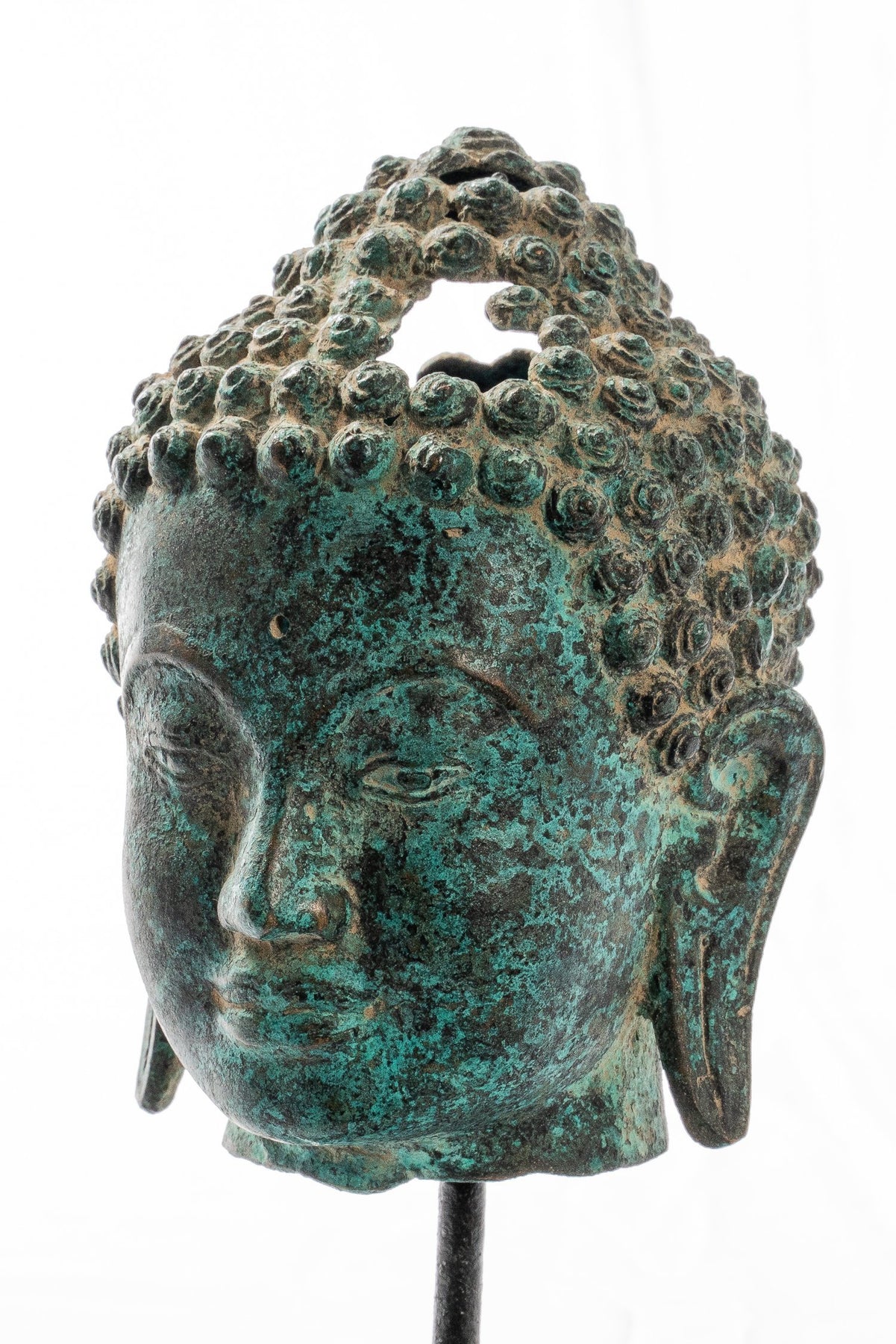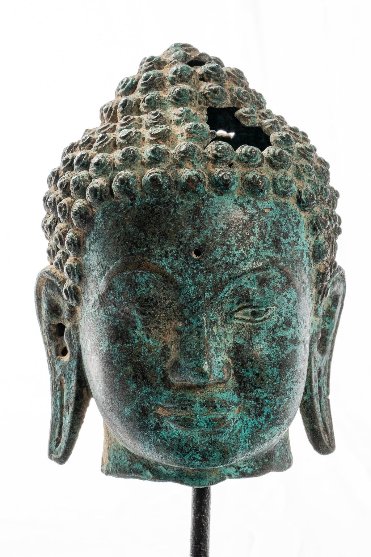 An antique Thai style, mounted Dvaravati Buddha head. A lovely Buddha with stunning detail and patina. The Buddha has a peaceful countenance with downcast introspective eyes and a firm brow. His earlobes are stretched long from a youth spent as a prince wearing heavy gold earrings. The casting is beautiful as you can see in the fine details of the face. Each detail is rendered perfectly. The distinctive patina of the piece is also particularly delightful.