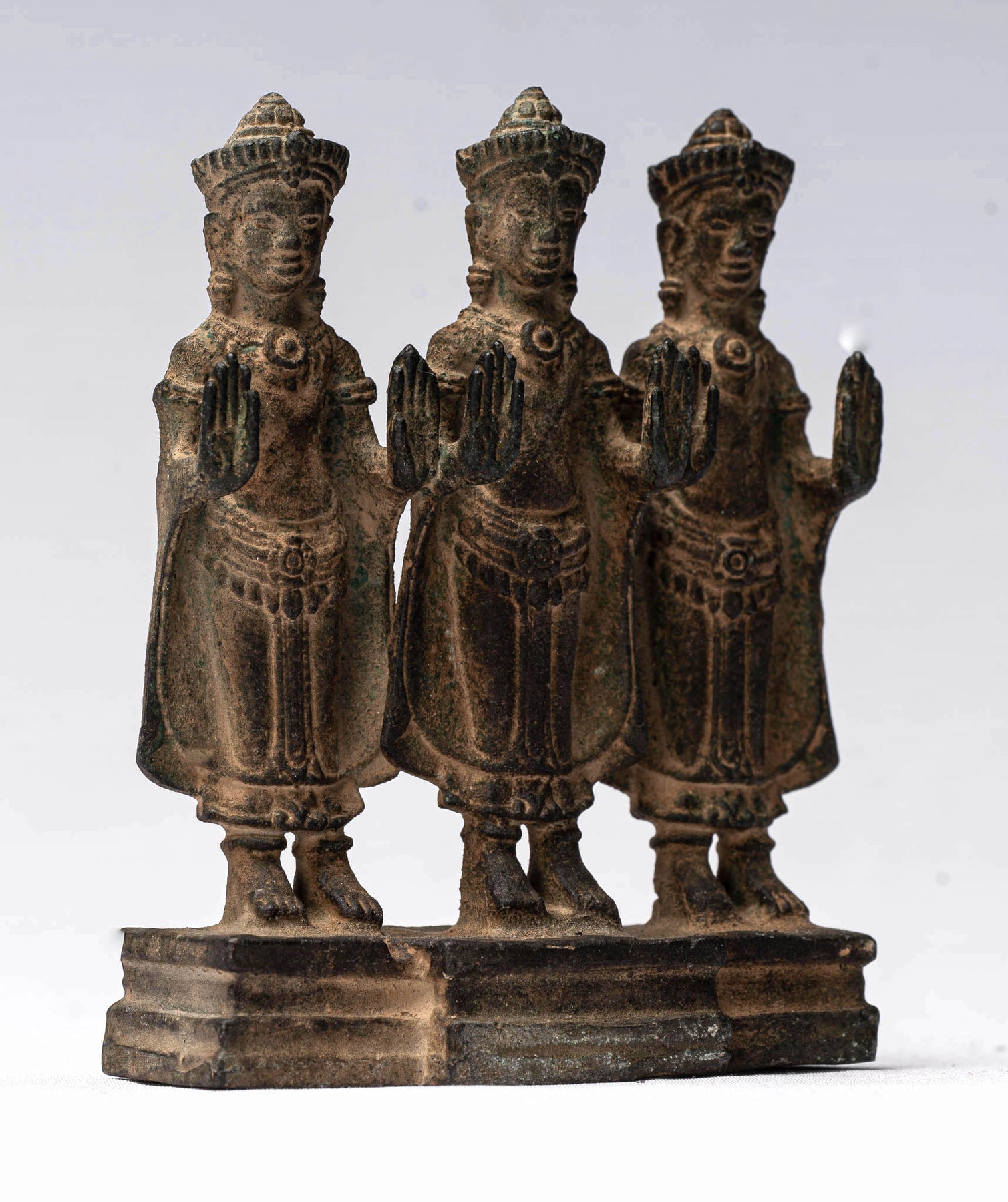 An antique Khmer style standing Buddha statue triptych from Cambodia. An unsual presentation of three Khmer Buddha. Each Buddha is stood sambhanga in the Abhaya or Protection mudra. A hand gesture that offers reassurance and safety - dispelling fear and according divine protection and bliss to the devotee. This is one of the earliest Mudra found depicted on a number of Hindu, Buddhist, and Jaina images.