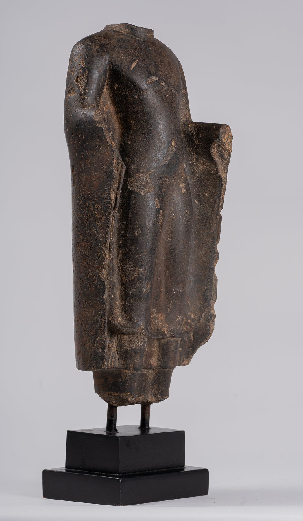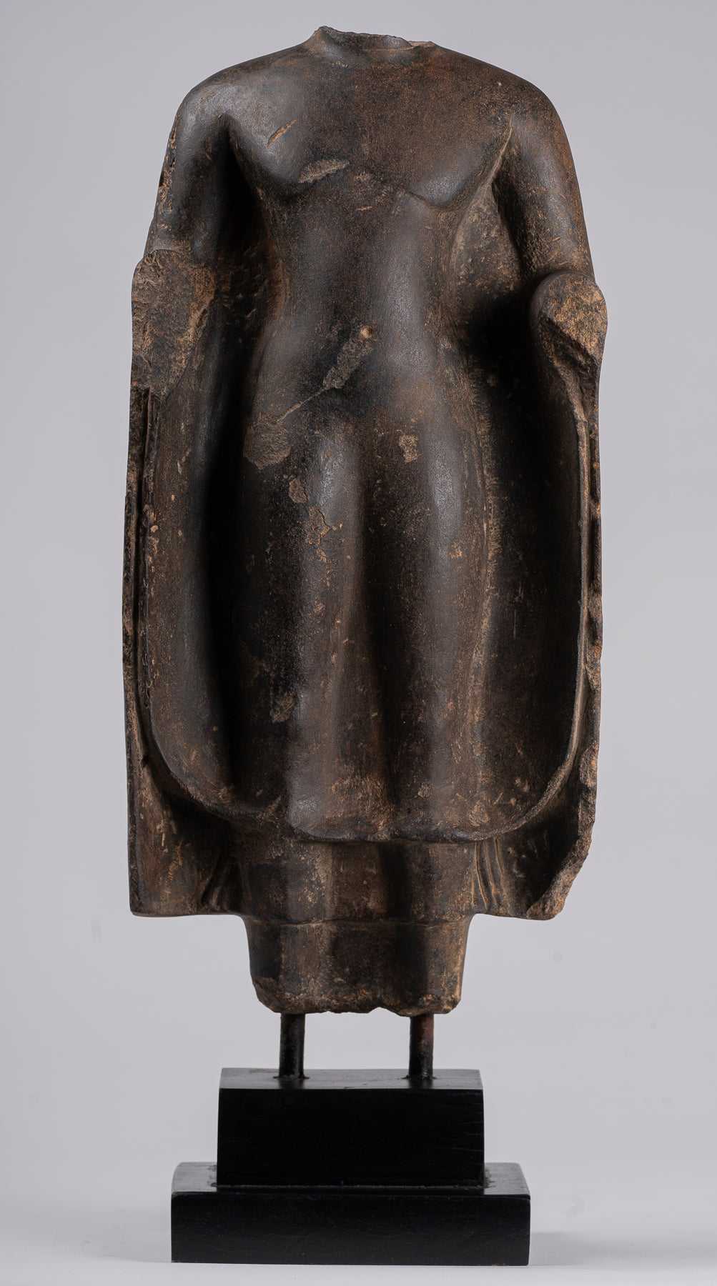 The arms are both broken off near the wrist. The position of the right forearm suggests that the missing hand was performing the vitarka mudra, the gesture of teaching, a common Dvaravati mudra. The slightly different angle of the projecting left forearm indicates that the left hand was depicted holding the ends of his robe, a few folds of which are still visible just below the arm. The Pre-Angkor-period seventh-century Buddha from Kompong Speu, just south of Phnom Penh, is shown in a similar pose with the same hand gestures, but without the wavy edges of the outer robe seen on the present Buddha's robe. The wavy drapery edges can be seen on an early Dvaravati-style Buddha torso in the Thompson Collection said to have come from Lopbur Province in Thailand,' and is an artistic characteristic found in seventh-century Indian art at Nalanda.