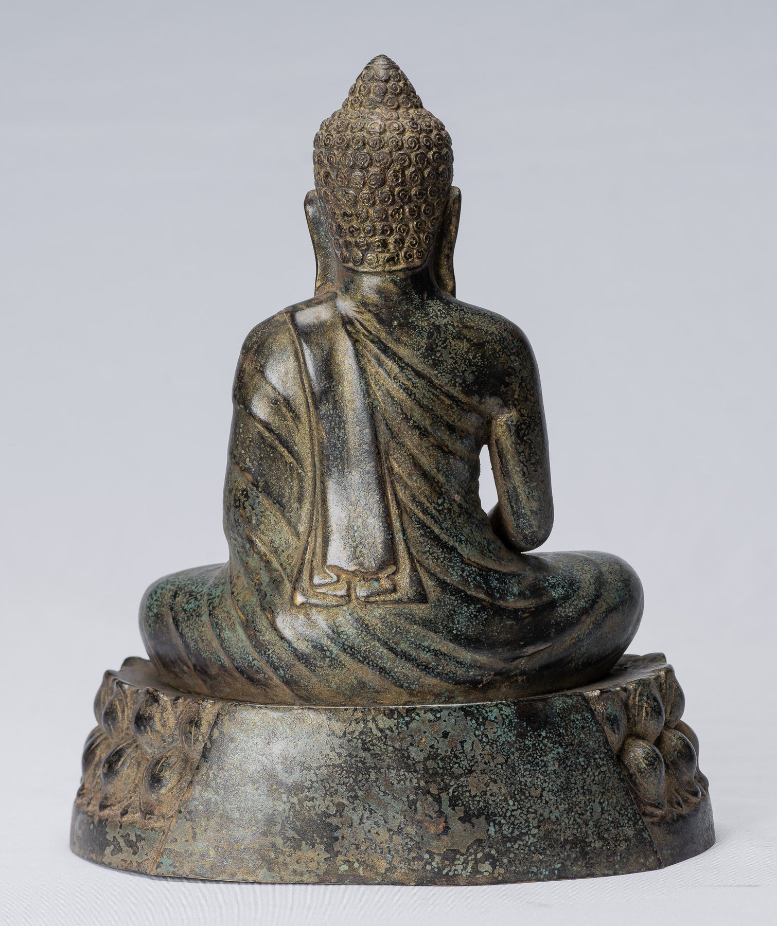 Antique Khmer style bronze enthroned Buddha statue. The Buddha has a peaceful countenance with downcast introspective eyes and a firm brow.