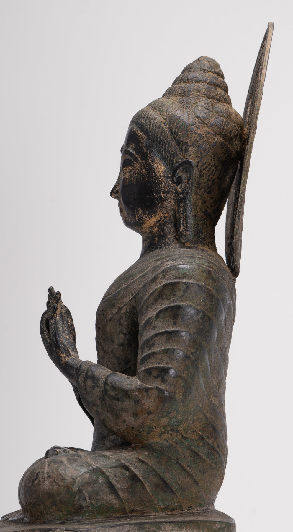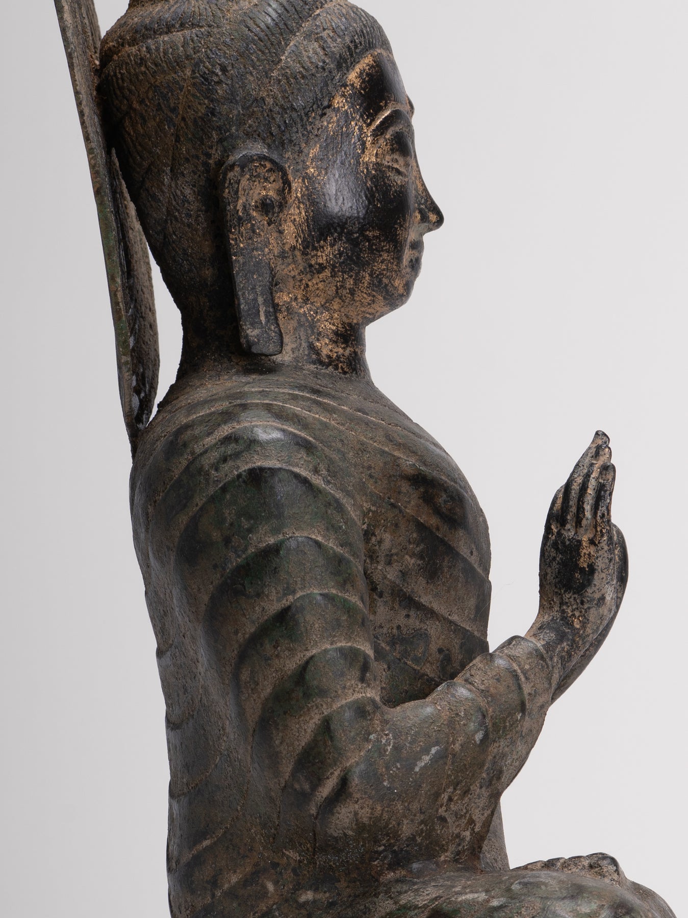 The bodies profile is with broad shoulders and slender waist, covered by an ornate Sanghati robe worn over both shoulders.
