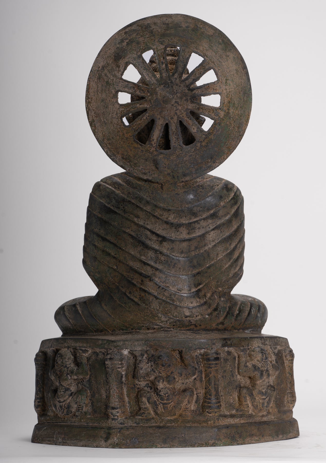 Buddha is seated on a pedestal held up by pillars and accolytes. The probable intent is to represent the historical Buddha as a transcendental figure seated on the cosmic mountain Meru, which is considered to be the center of the universe.