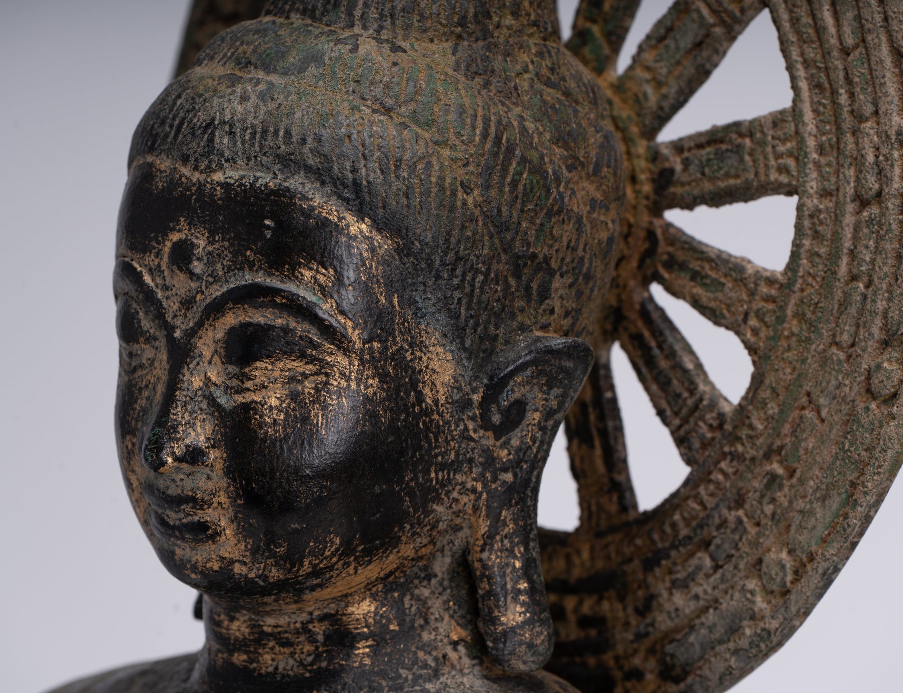 The Buddha features an oval face, with almond shaped downcast eyes. Curved eyebrows meet above a prominent nose, and contoured lips with an exalted expression, appear smiling. His hair form a heart shaped line around the face, The head is surmounted by a hemispherical ushnisha, symbolizing his high level of spiritual development. His earlobes are stretched long from a youth spent as a prince wearing heavy gold earrings.