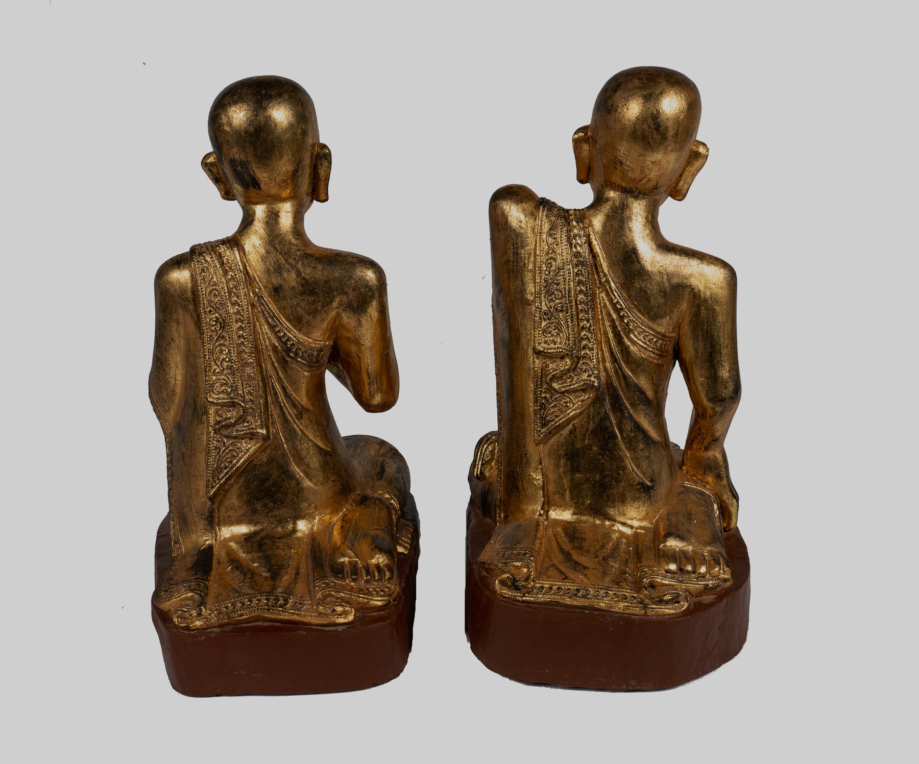 A pair of antique Burmese style Buddhist disciples - Shariputra and Maudgalyayana. Depicted as freestanding sculptures each is sat respectfully with their legs to one side. Shariputra is leaning forward, listening attentively. Maudgalyayana holds his hands together in reverence. Contemporaries of Buddha, they were legendary for their piety and power.