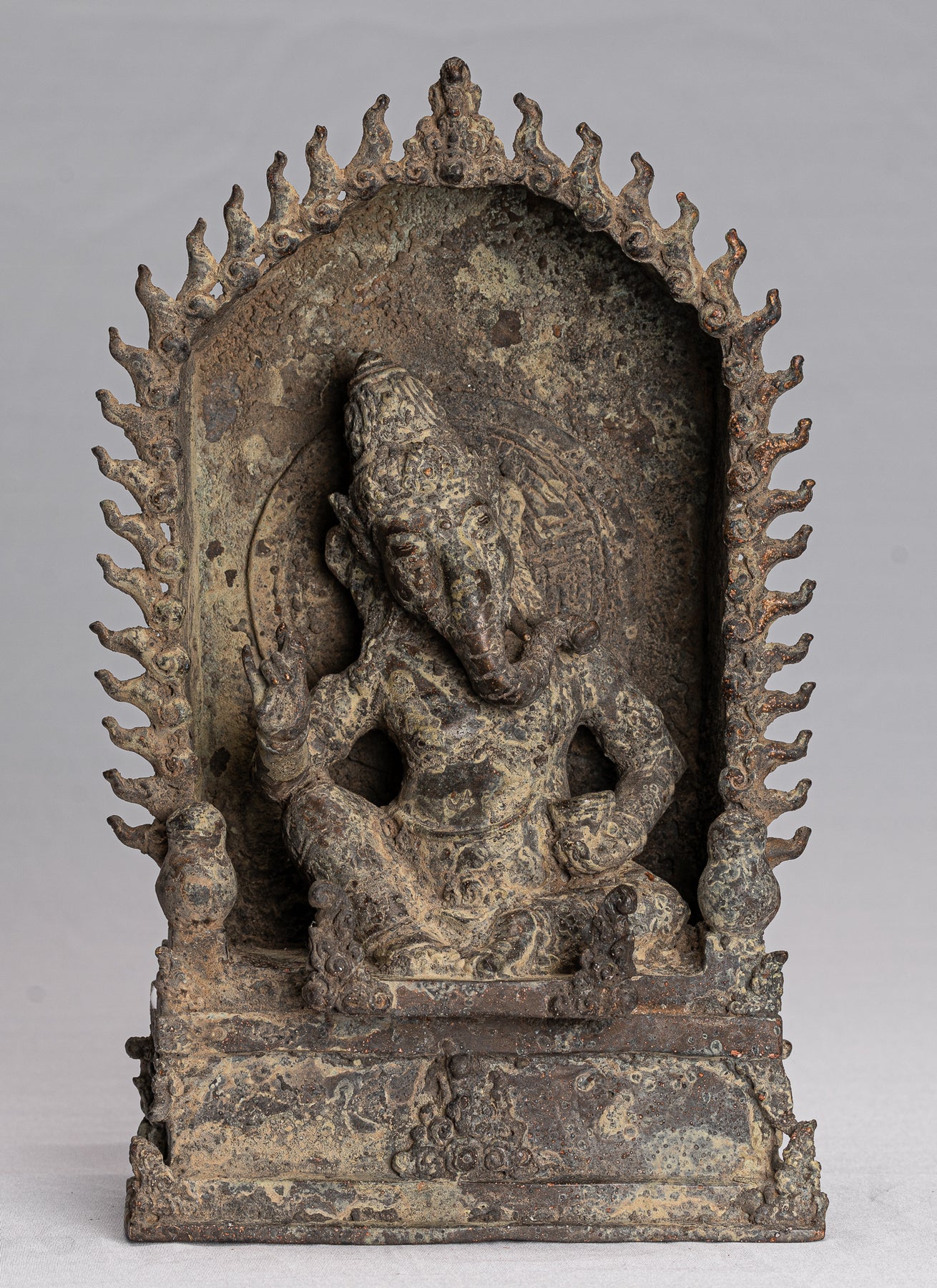 Ganesha Statue - Antique Khmer Style Enthroned Angkor Wat 8 Arm Ganesh Statue - 22cm/9"