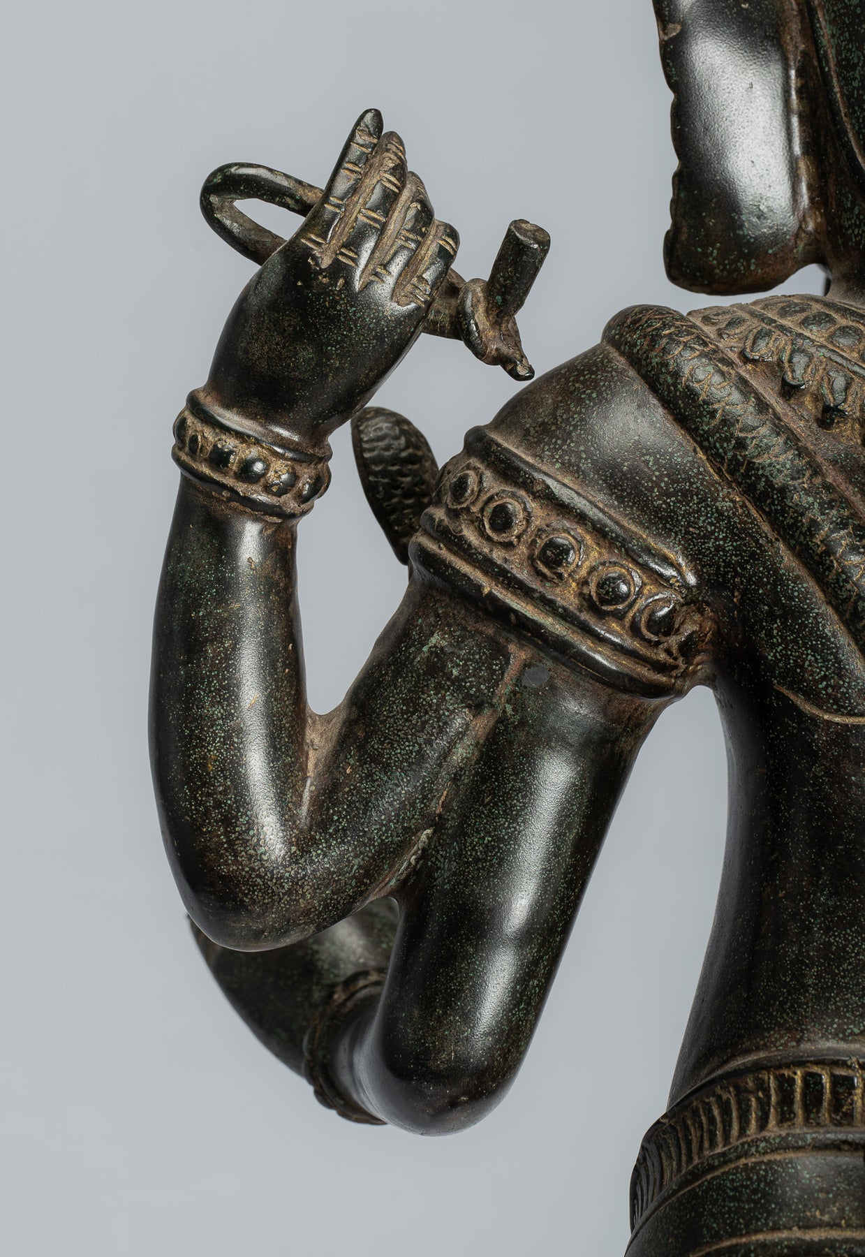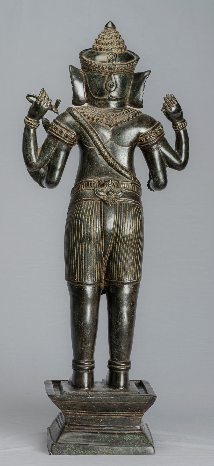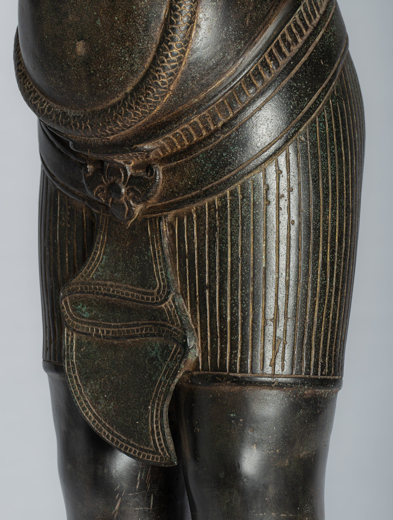 This magnificent bronze figure has facial features and ornate jewellery typical of the Angkor Wat style. The cylindrical piling up of the hair into a high chignon and regimented hair curls demonstrate the ecumenical nature of iconography in the Angkor period, the former associated with the supreme form of Vishnu, the latter with Shiva.