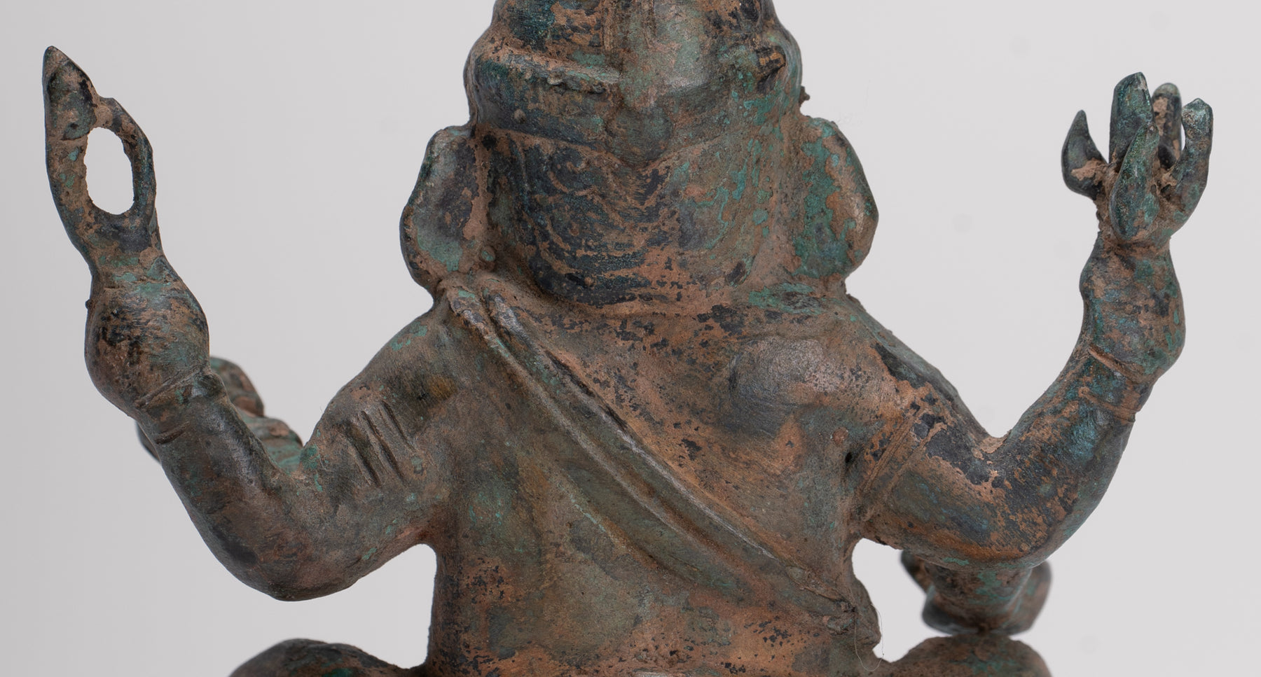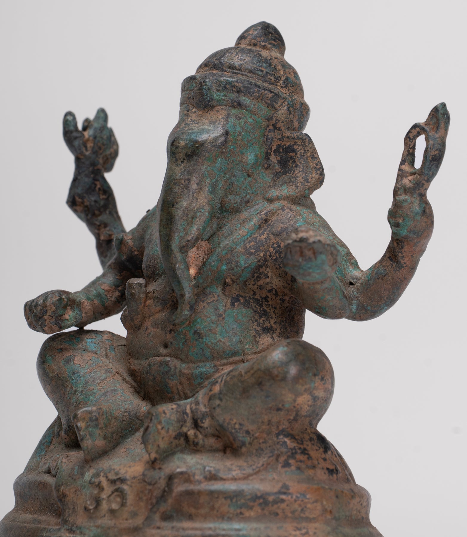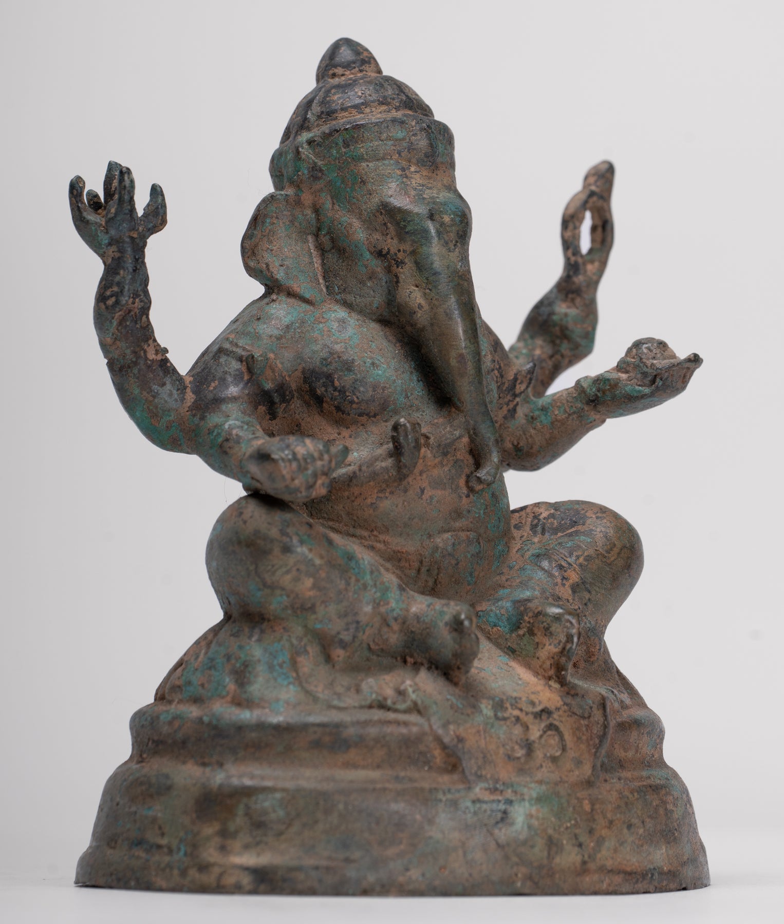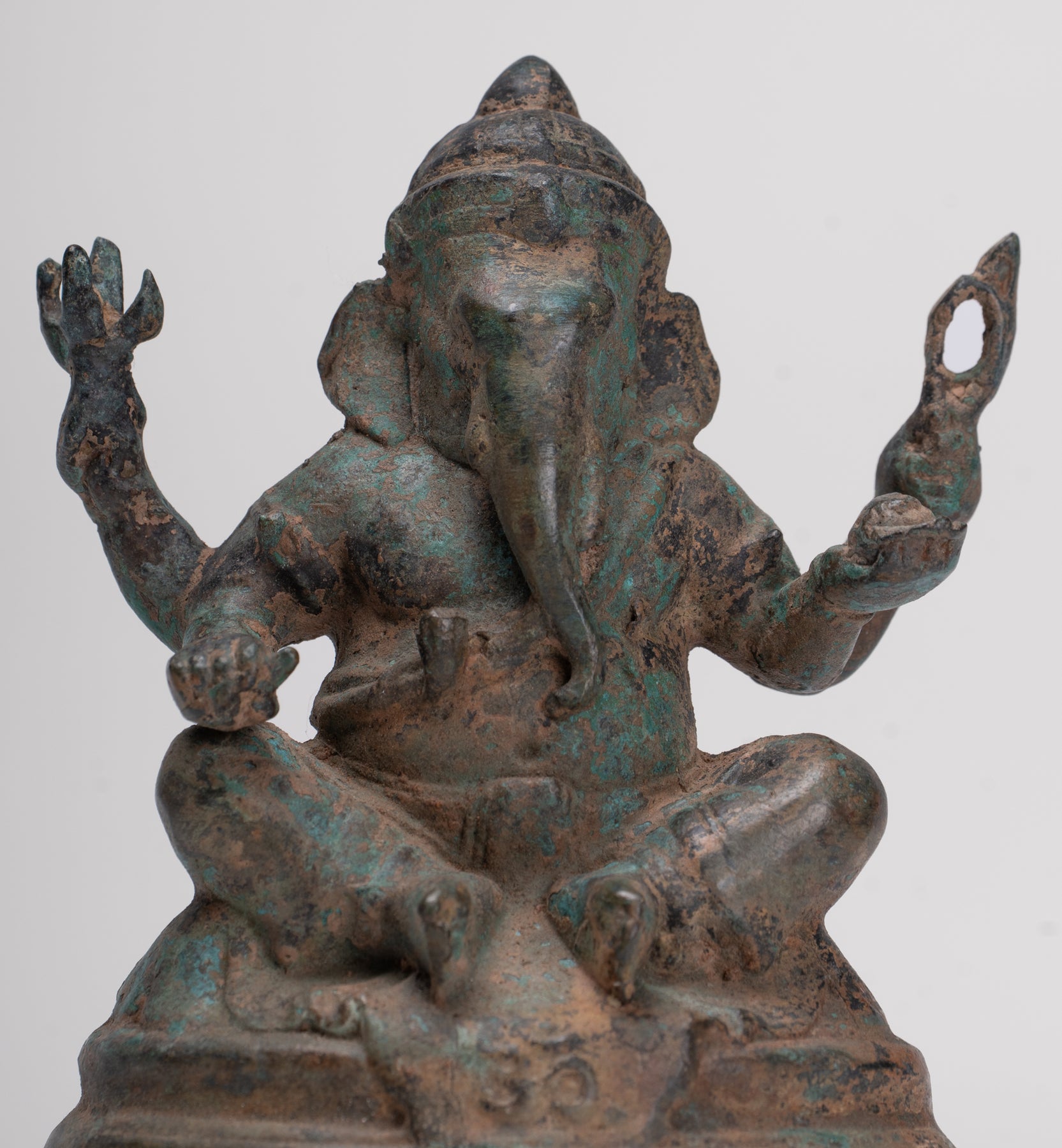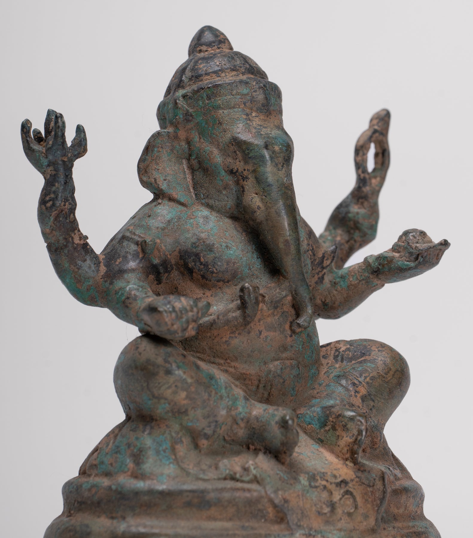 The bronze has developed a particularly attractive, varied patina, enhancing the depth of the modelling and lending the piece a rich, time‑softened character. Ganesha, the elephant‑headed son of Shiva, holds his trident and sweetmeats, together with a noose and his broken tusk in his four hands – classic attributes that speak to his roles as protector, guide and remover of obstacles.