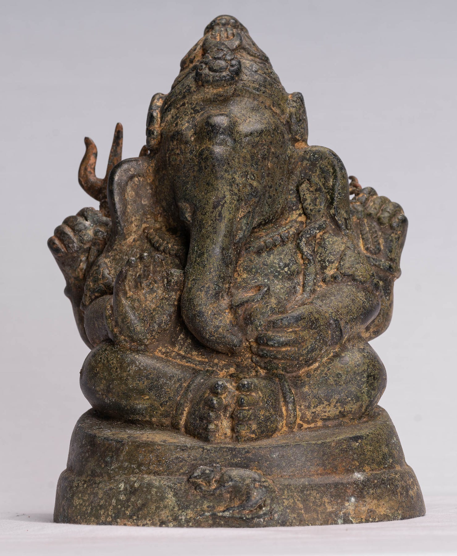 An expressively cast Antique Thai style bronze 4-arm Ganesha seated over a circular pedestal embellished with a mouse.
