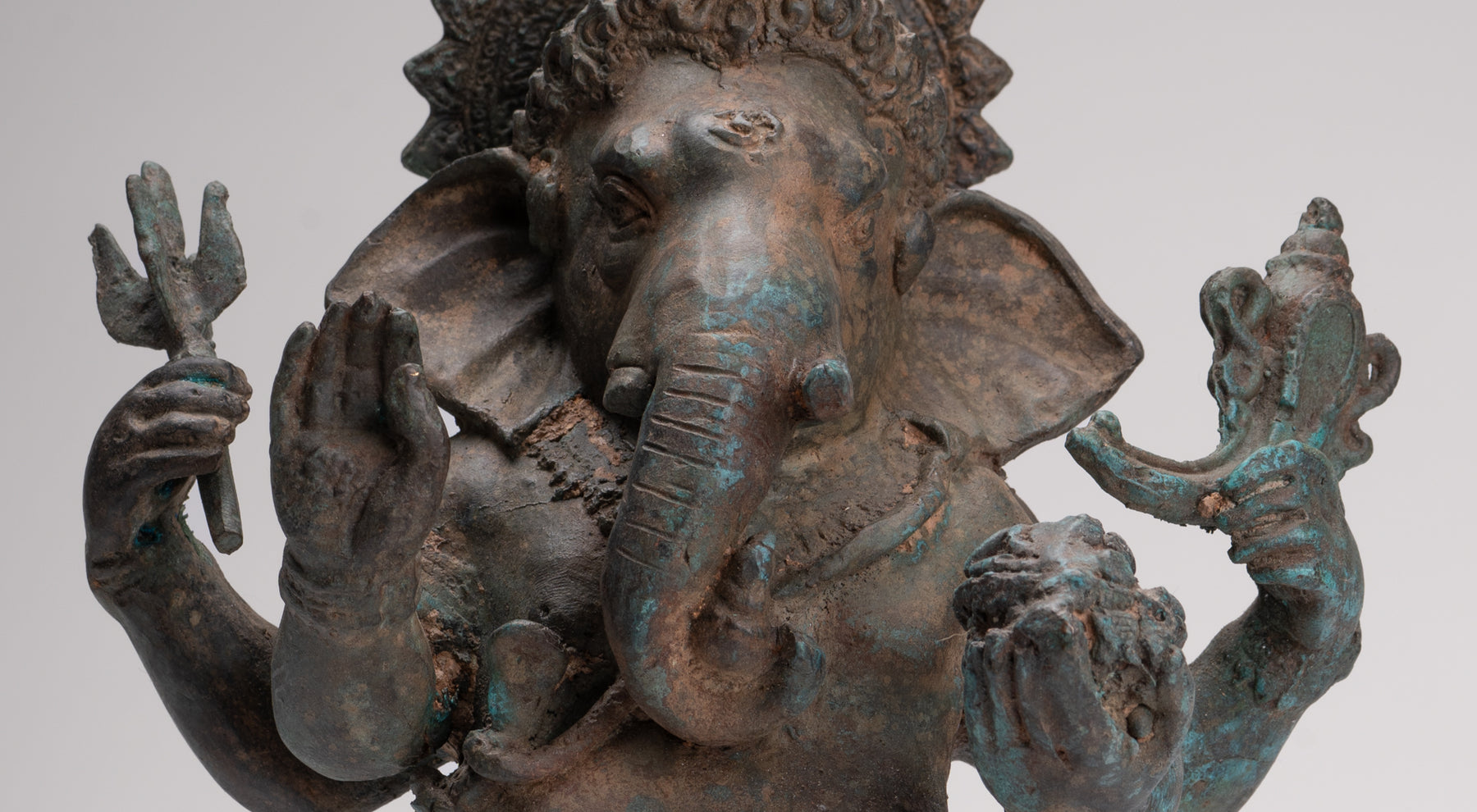 This relates to Ganesha’s status as a Vedic God, which means he does not forget even those who are not his devotees and instead looks out for everyone. This is communicated through his depiction as always looking upwards or at eye-level, as he is surveying all human life and is therefore not solely focussed on those praying to him.