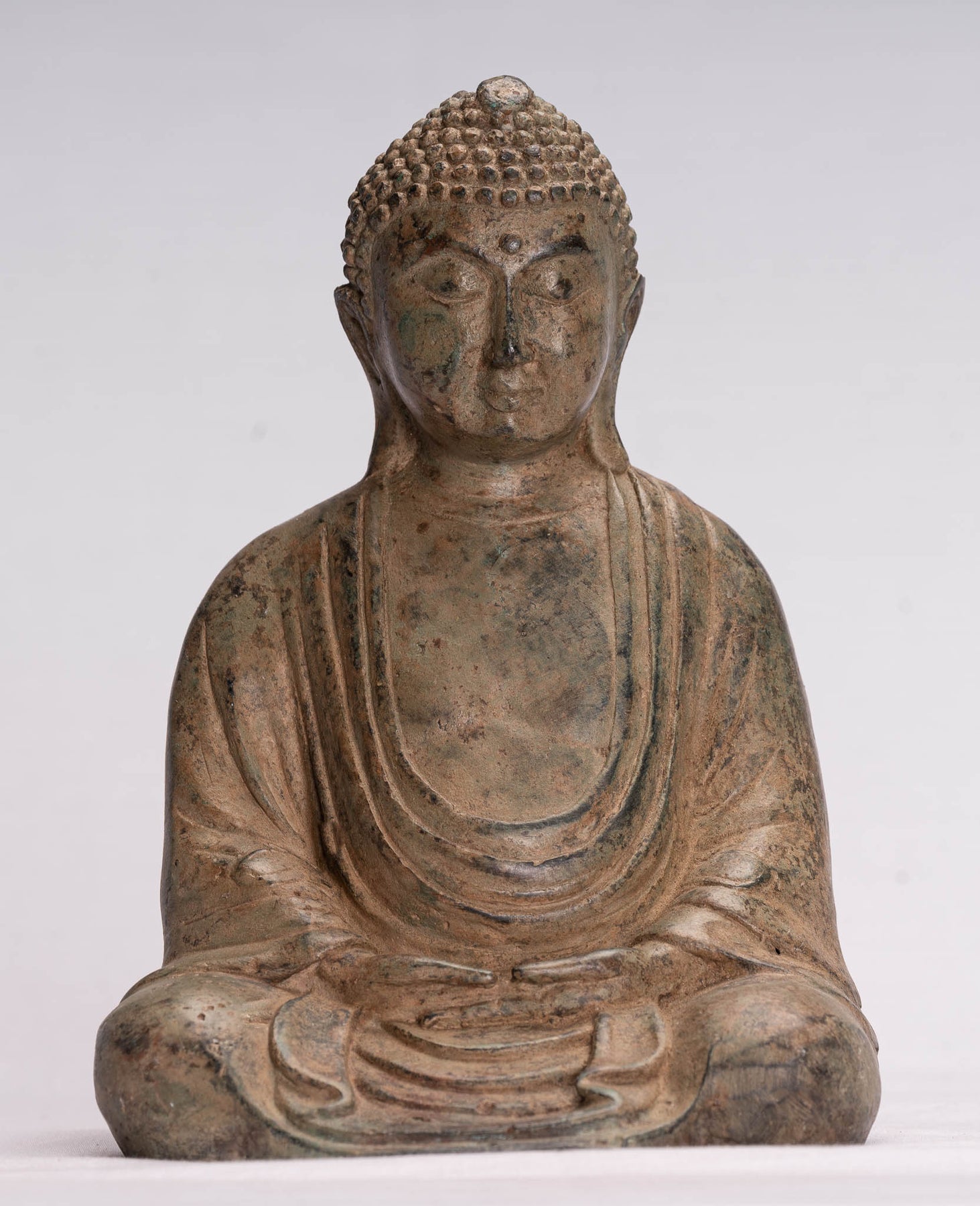 Antique Japanese Style Seated Bronze Meditation Amitabha Buddha Statue - 18cm/7"
