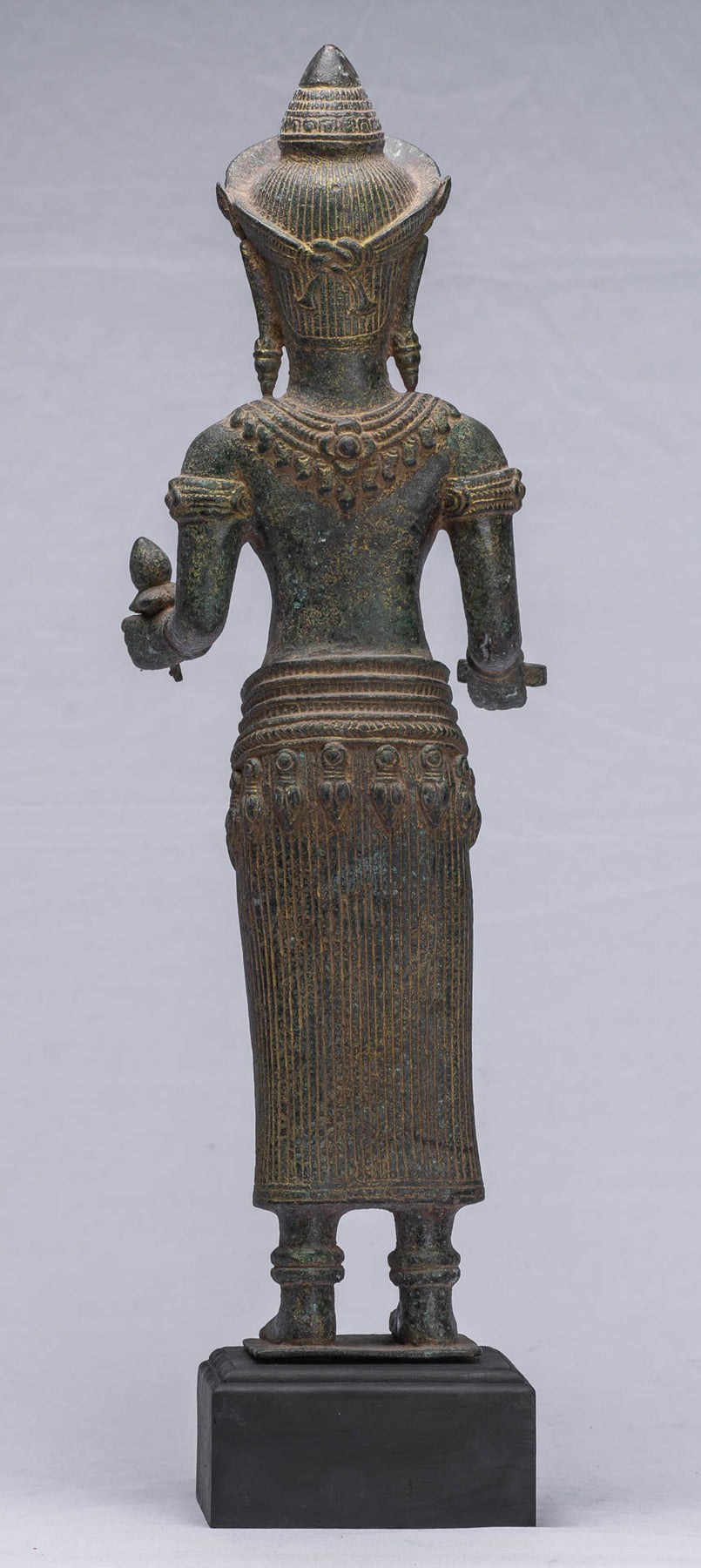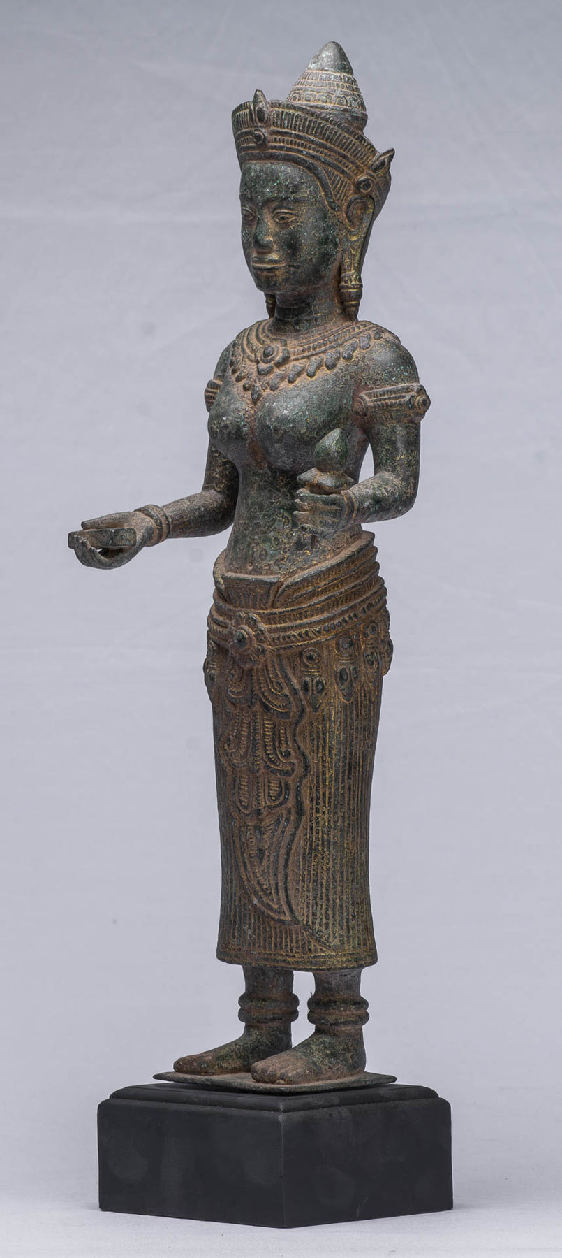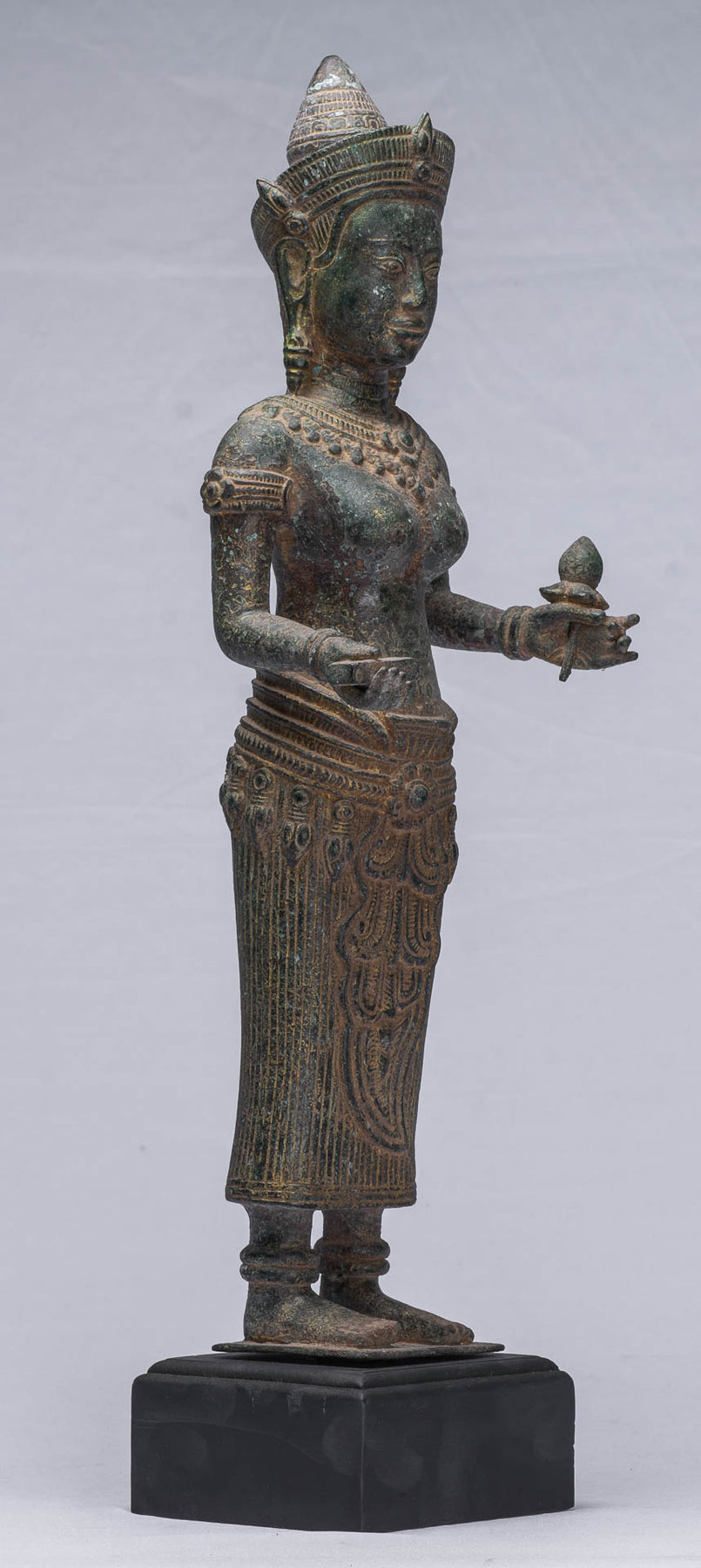 The Lakshmi is mounted on a bronze base which forms part of the sculpture. The malachite patina and details of this piece are particularly appealing.