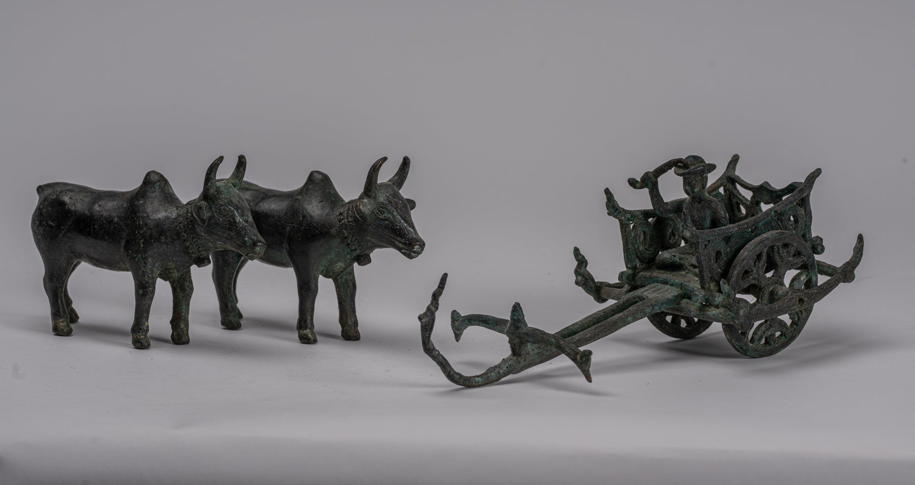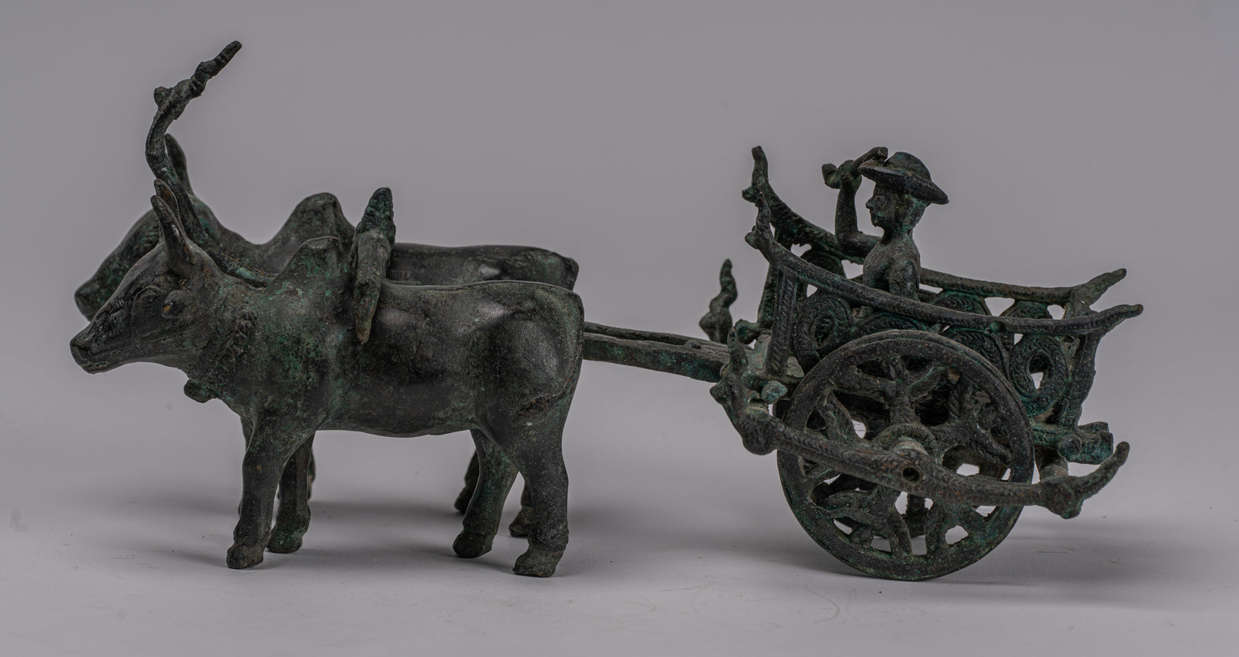 Antique Khmer Style Bronze Ox Cart Statue - 24cm/10"