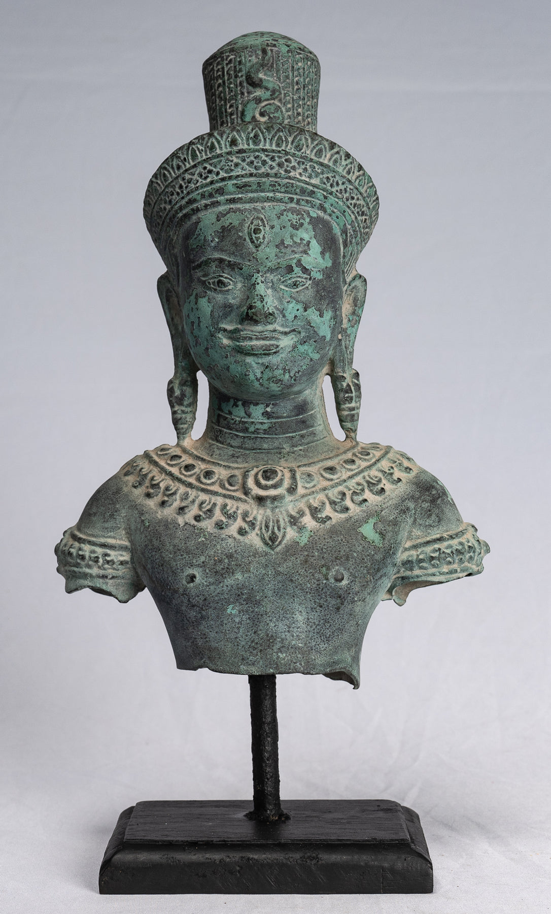 An antique Khmer style bronze Shiva torso, mounted on a wood base (later), in the distinctive pre-Angkor Koh Ker style.