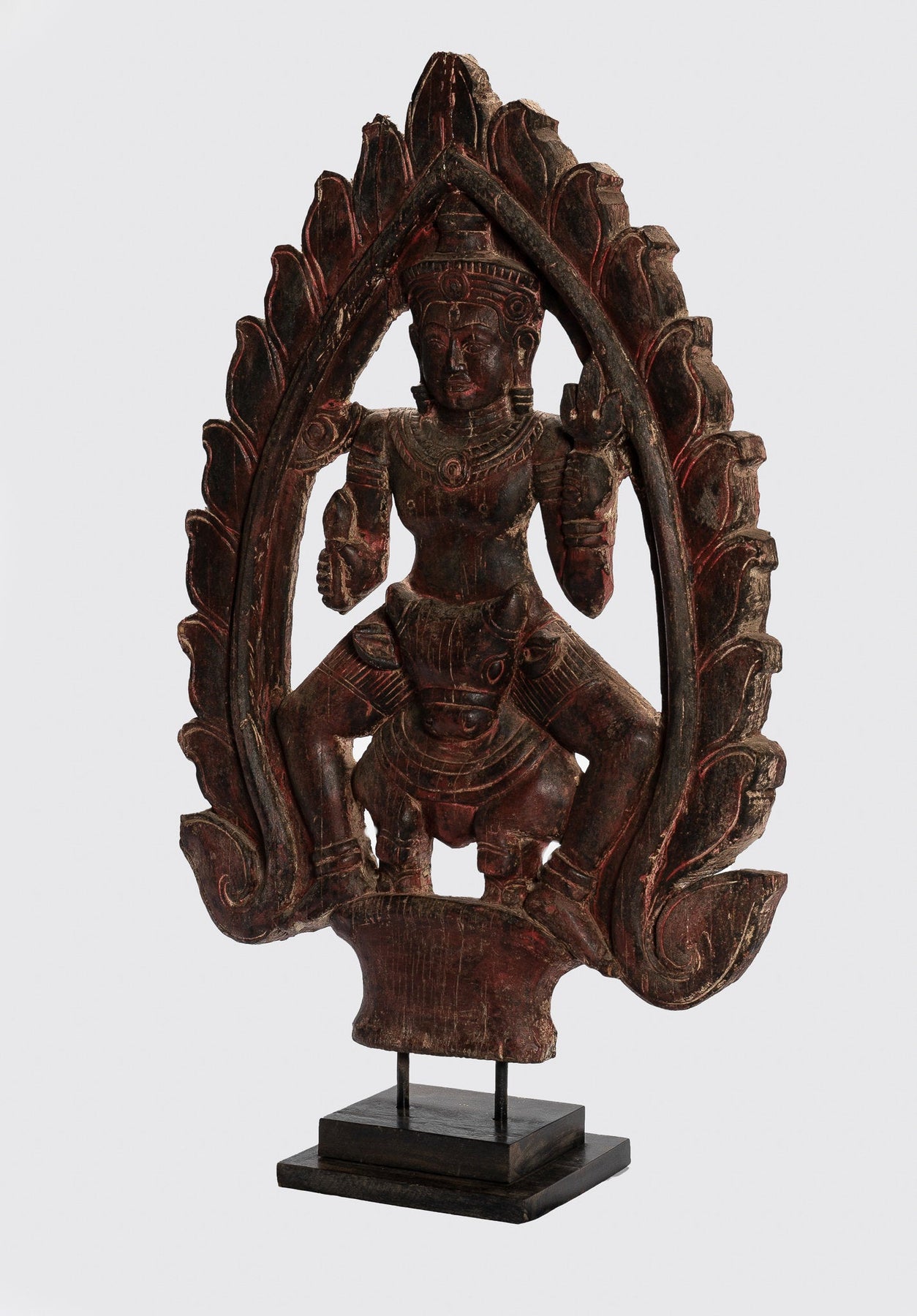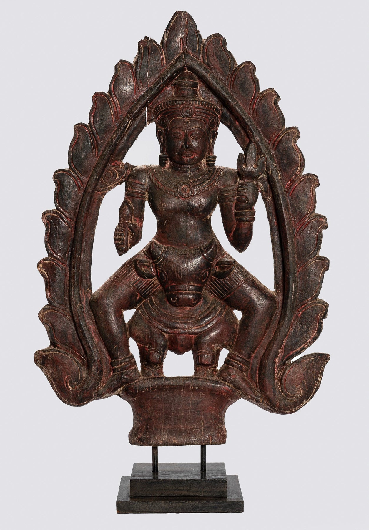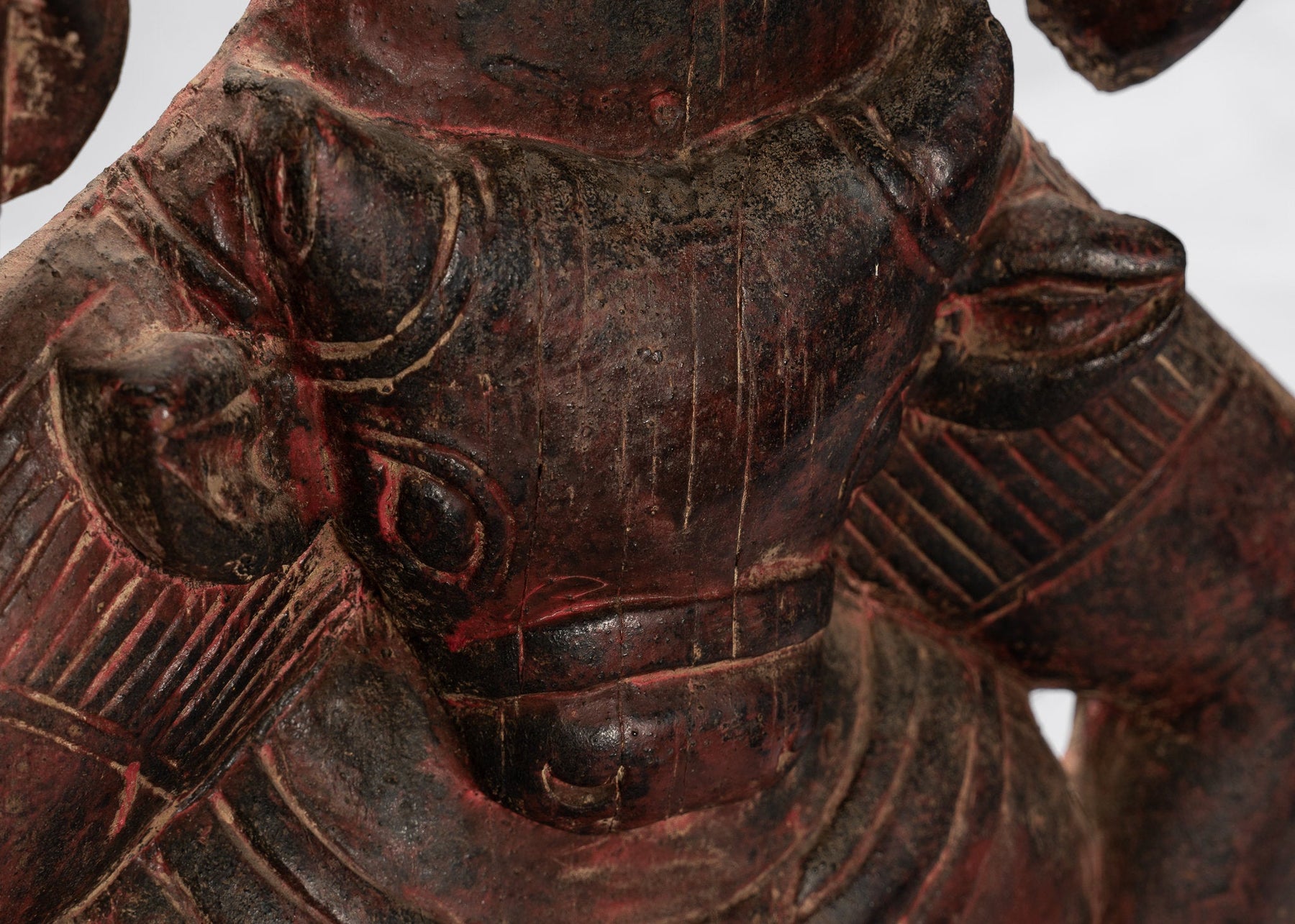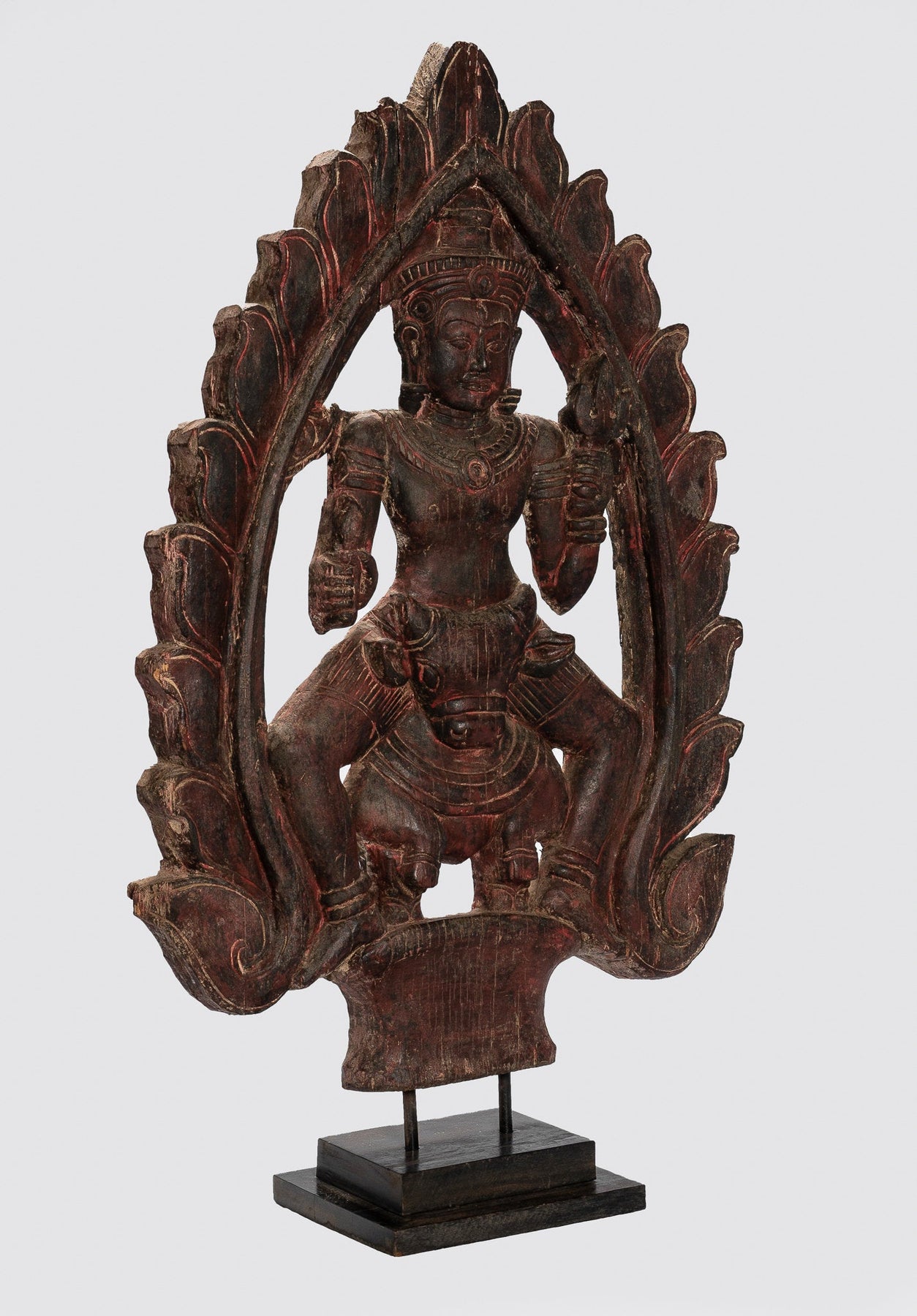 This openwork finial depicts an antique Khmer style mounted wood Shiva riding his mount Nandi from Cambodia.