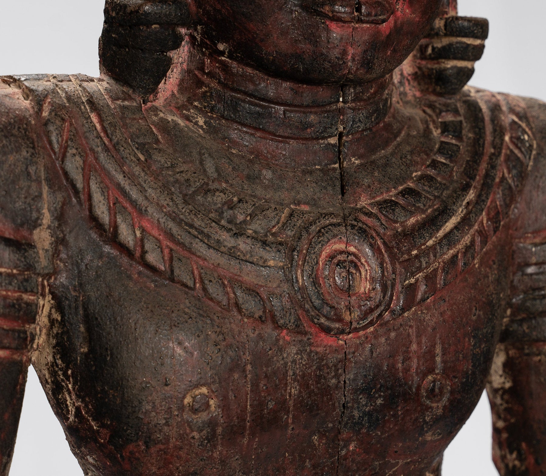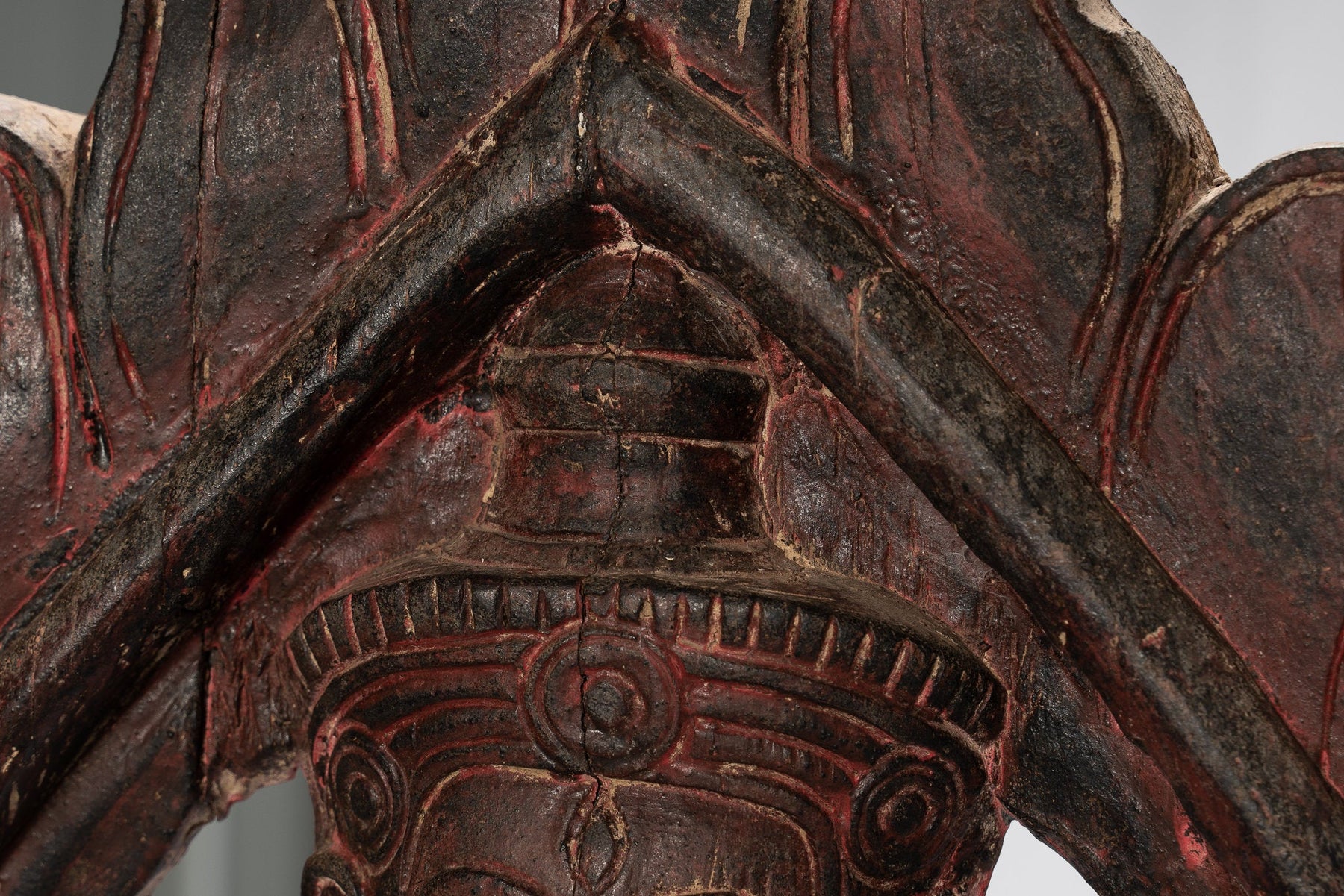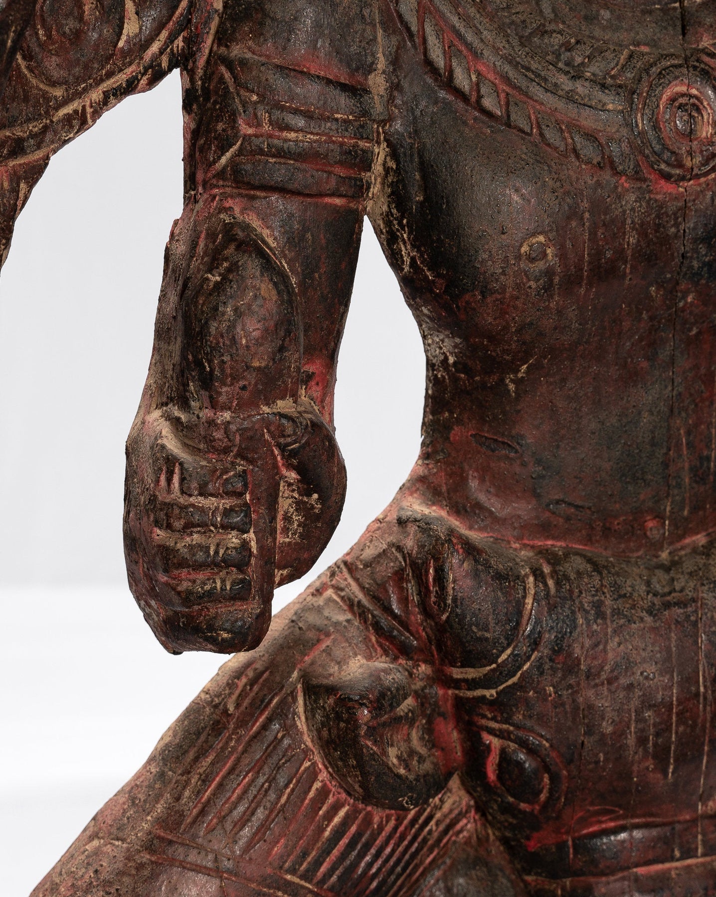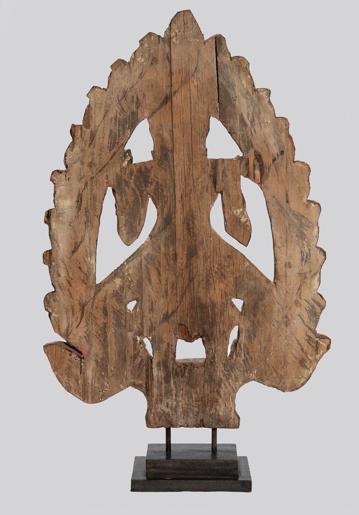 This openwork finial depicts an antique Khmer style mounted wood Shiva riding his mount Nandi from Cambodia.