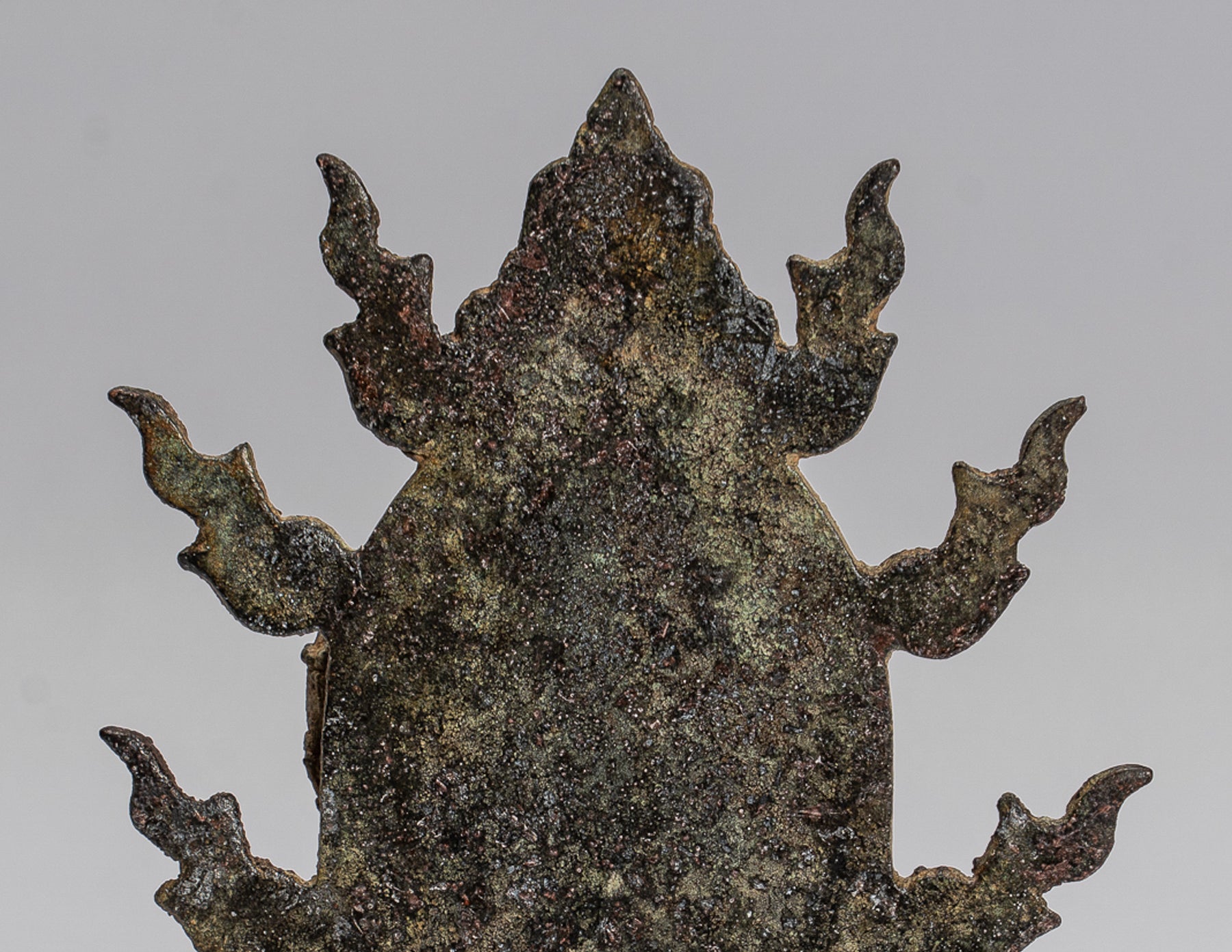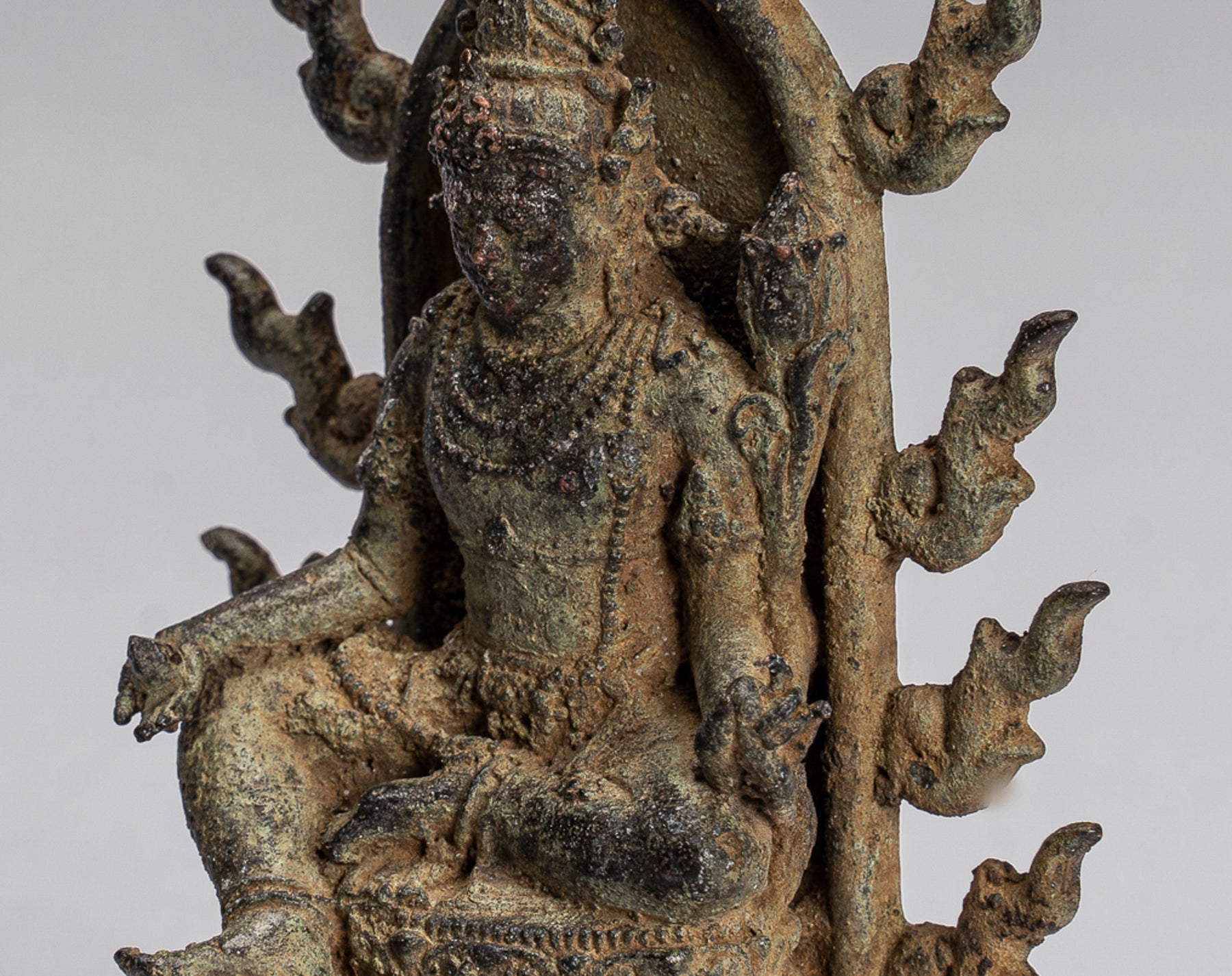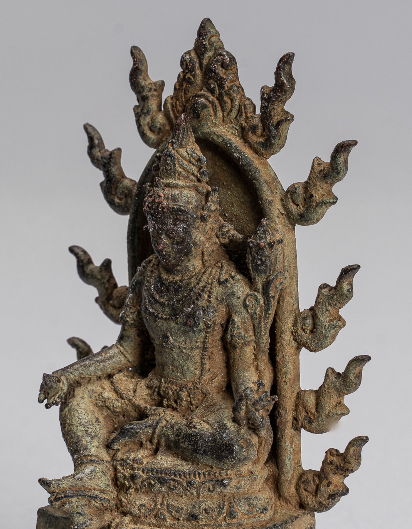 This symbolises her control over Positive and Negative attitudes. She has an aquiline nose and elongated earlobes with large earrings. An aureole with flaming rim stands behind representing her divinity.