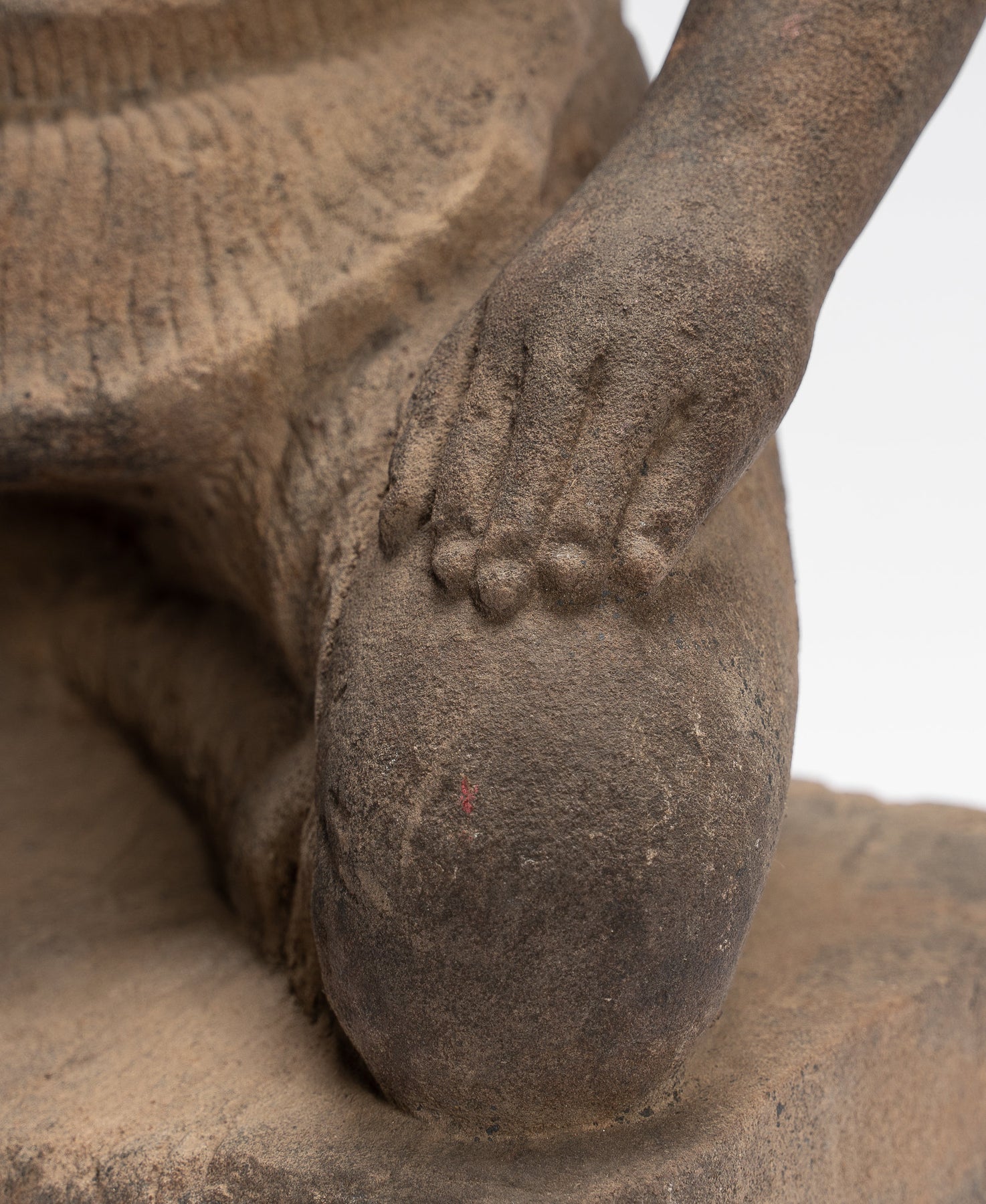 This impressive stone sculpture shows a male deity (probably Vishnu) seated panhandle. He is clothed in a pleated sampot can kpin, in Koh Ker style, with a bow behind that has been naturalistically represented to accommodate the kneeling pose. The artist's ingenuity is particularly noticeable in the way the left foot is shown sideways at the back.