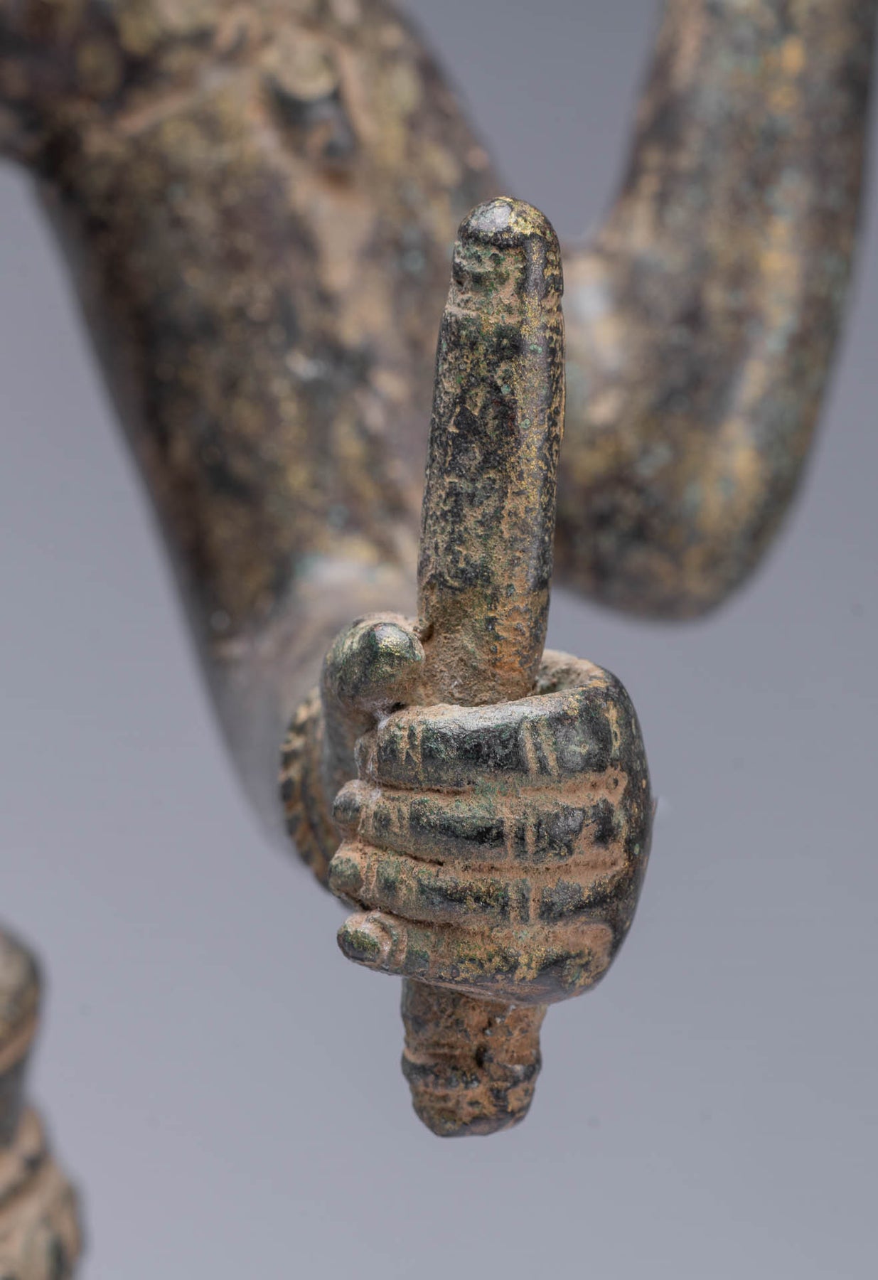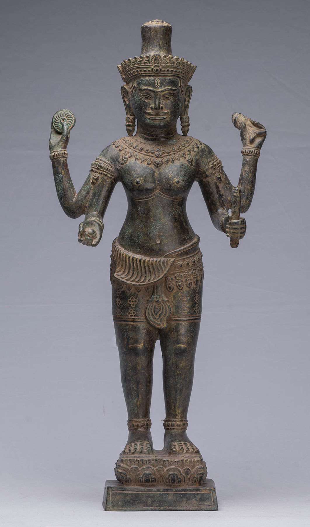 Vishnu is clad in a short sampot with fishtail pleat and jewelled sash, the face with wide features surmounted by a cylindrical headdress. Here Vishnu, as the protector and preserver, is holding a chakra discus and conch shell. He also holds in his lower left hand his gada or mace symbolising his mental and physical strength.